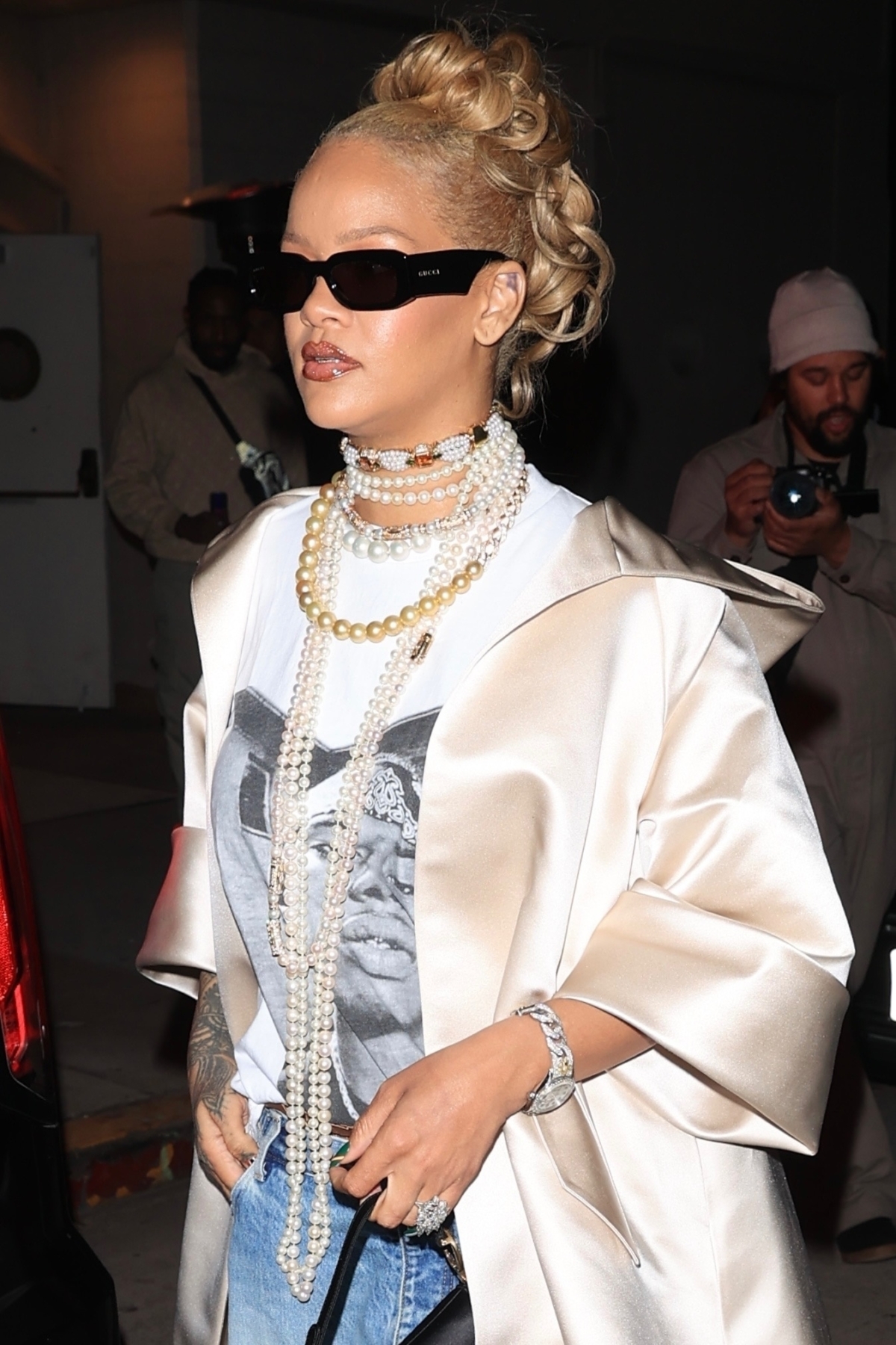 Rihanna 身穿搖滾 T-Shirt、工裝開衩褲裙,外搭一件搶眼豹紋大衣,選擇配戴 Gucci 長方框太陽眼鏡,採用奪目的黑色醋酸纖維結構,營造出充滿現代感的設計,鏤空 Interlocking G 標誌豐富了鏡臂的設計元素,靈感源自馬術世界的織帶細節!更搭配創意總監 Sabato De Sarno 上任後重塑經典的 Gucci Marina Chain 項鍊,更顯時髦!