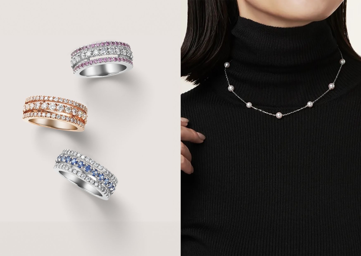 MIKIMOTO LOVE 字樣珍珠胸針,NT$ 23,000;MIKIMOTO 粉紅K金鑽戒,NT$ 216,000;MIKIMOTO 藍寶石鑽戒,NT$ 186,000Photo from MIKIMOTO