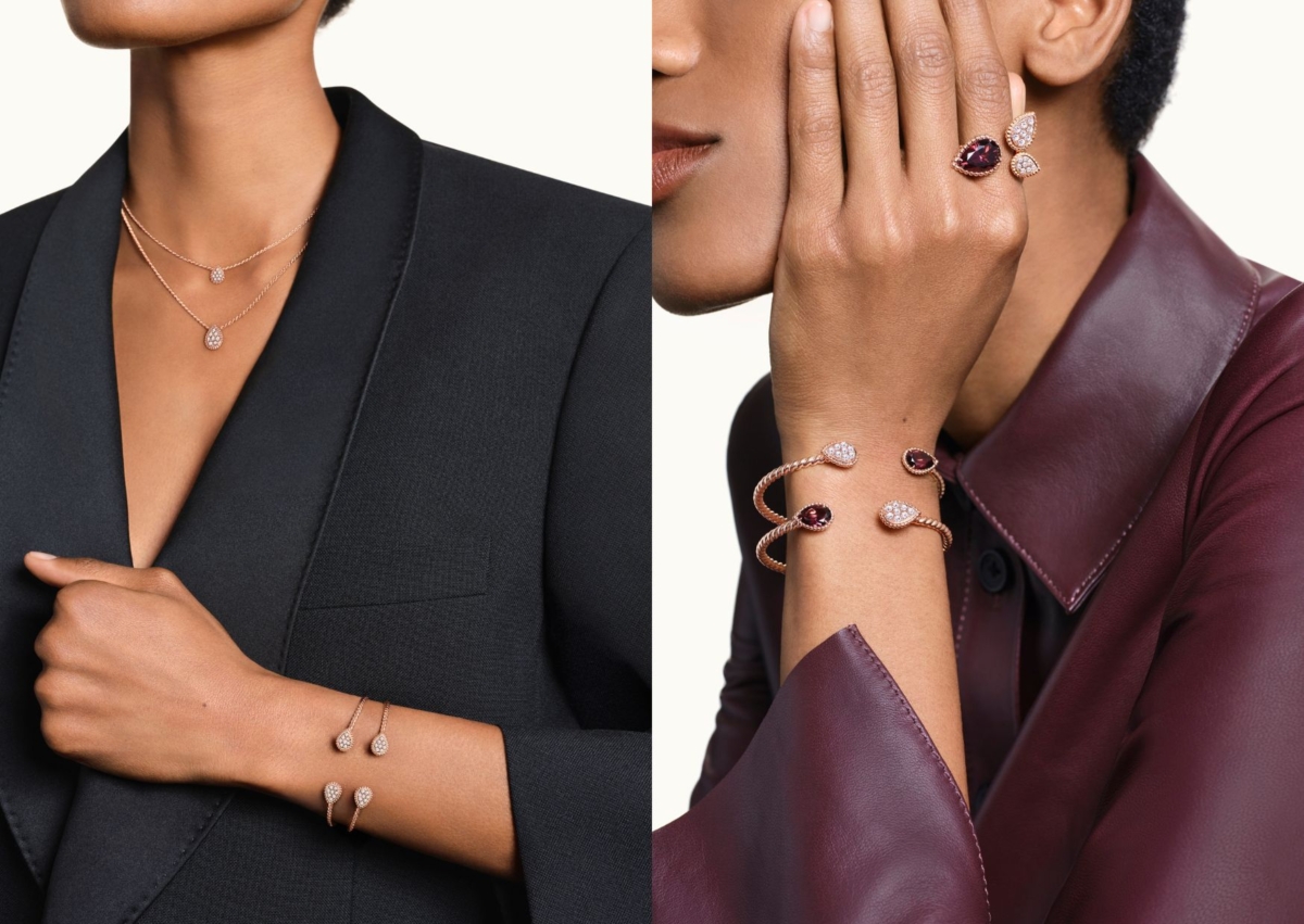 Serpent Boheme系列手環玫瑰金750材質、鎳鈦諾鑲嵌鑽石、紅色石榴石,NT$ 255,000;Serpent Boheme系列戒指玫瑰金750材質鑲嵌鑽石、紅色石榴石,NT$ 335,000 Photo from Boucheron