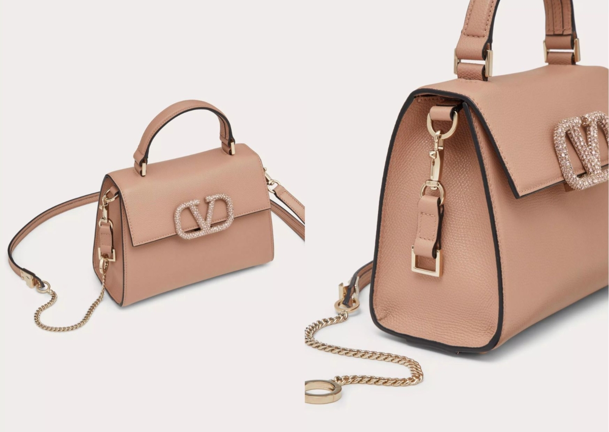 近期因熱播韓劇《淚之女王 》竄紅的金智媛在劇中就經常揹上各種精品包,這顆Valentino Garavani Vsling 小手提包也出現過不少次,採顆粒狀小牛皮製成,包身重點是正中間的 V Logo 標誌扣,覆蓋著施華洛世奇®水晶,手提肩背都很優雅,更在低調中仍有滿滿的奢華女王氣勢!
