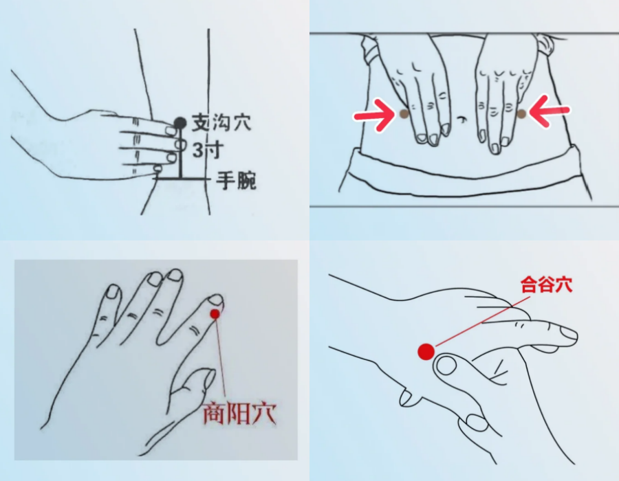 也可以試試傳統穴道按壓法,第一個支溝穴在手腕橫紋下方大概3隻手指頭的位置,可以感受到骨頭中間有凹陷處,用拇指按揉左手右手兩邊;第二個天樞穴在肚臍旁邊約3隻手指頭向外的位置,一樣按揉幾分鐘;第三個商陽穴俗稱「人體開塞露」,食指末端距離指甲側邊大概0.3公分的位置,向下按壓;第四個合谷穴在虎口處肌肉最頂端位置,邊按邊揉開。