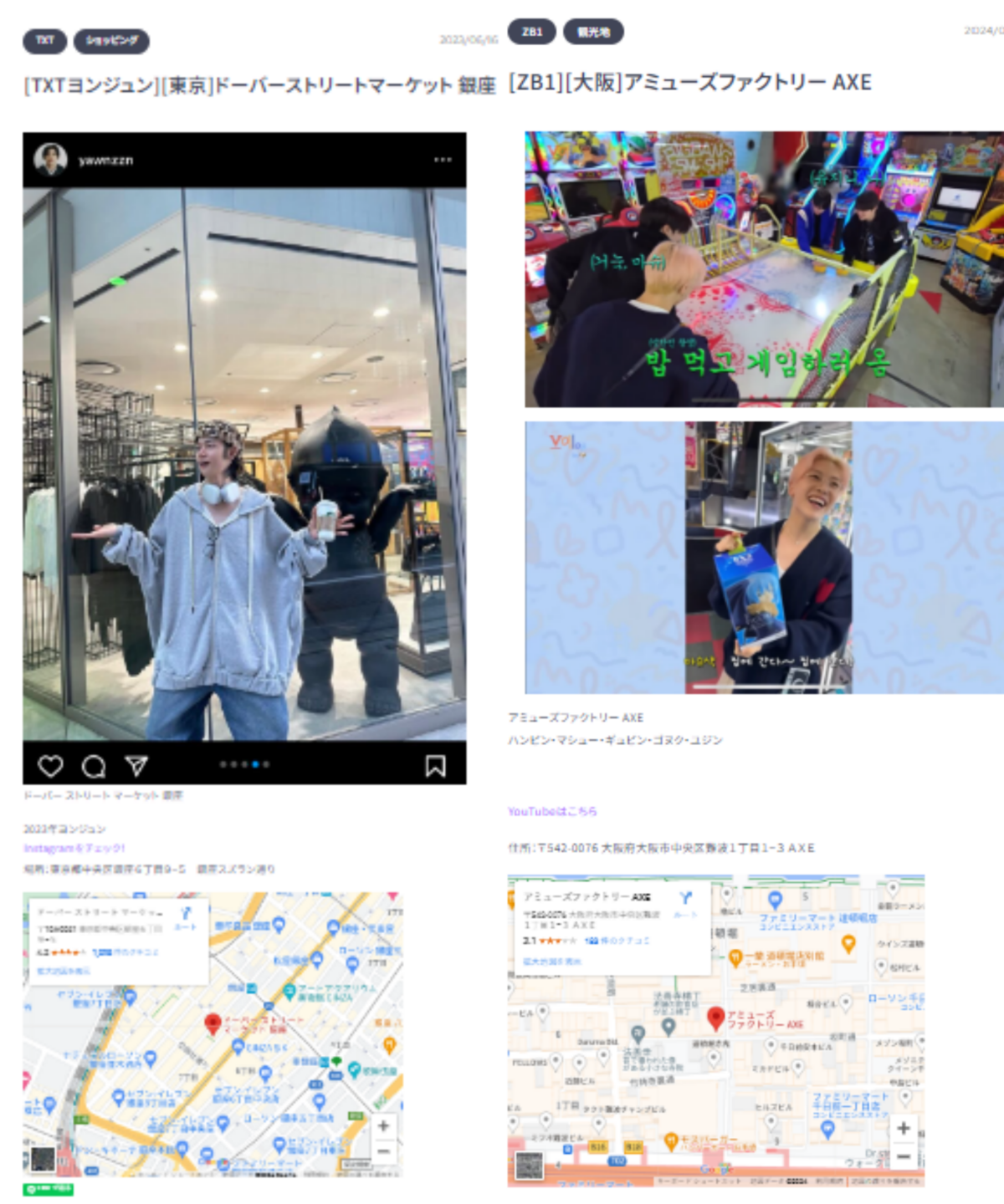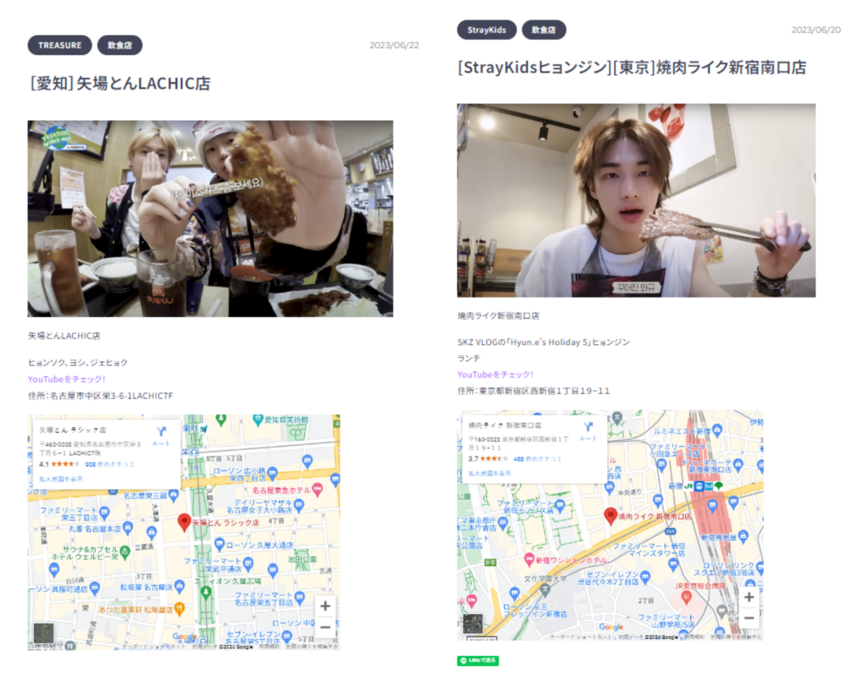有些會是偶像們在節目、VLOG上去吃過的餐廳、服飾店、扭蛋店、遊樂場,店進去內容會看見「確切店名」、「什麼時候、那些成員去的」、「資料來源連結」及「店家、地點詳細地址位置」,超清楚的整理讓粉絲超級方便蒐集!