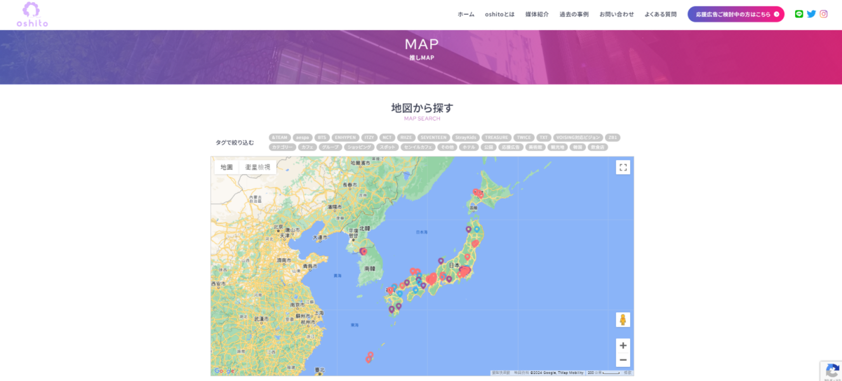 K-POP偶像打卡聖地不用再一一到處找資訊了!有一個日本網站oshito就開設了叫「推しMAP」的子站,專門幫粉絲們整理好K-POP團體去日本時到訪過的地點。網站一進去可以看到有不同的偶像標籤及地圖,地圖上滿滿的標記都是韓國偶像們曾經去過的地方,點選不同標籤就可以看到所有定點分布。