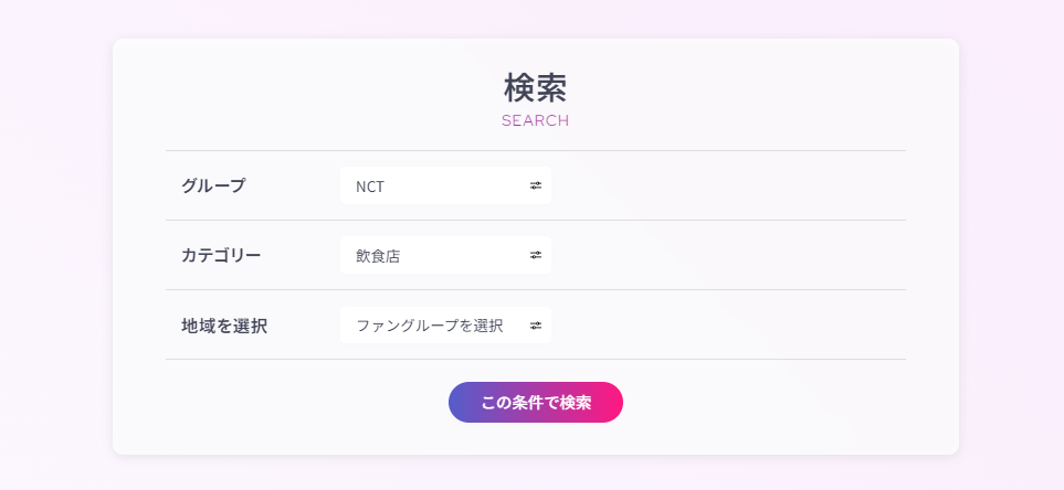下方也有可以直接搜索的方式,能夠快速找到自己喜歡的團體去過哪裡,第一欄選擇團體名稱,第二欄選擇想要知道的地點類別,像是餐廳、公園、美術館等等,第三欄則可以不用特別選擇。