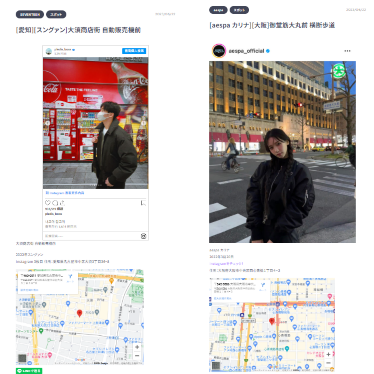 就連偶在IG、X上面po出的貼文都會仔細查找位置,並整理出來大家!就算只是路邊隨意照相的照片都可以找出來在哪,超厲害~想要和偶像拍一樣風格超Chill的照片完全不困難♡