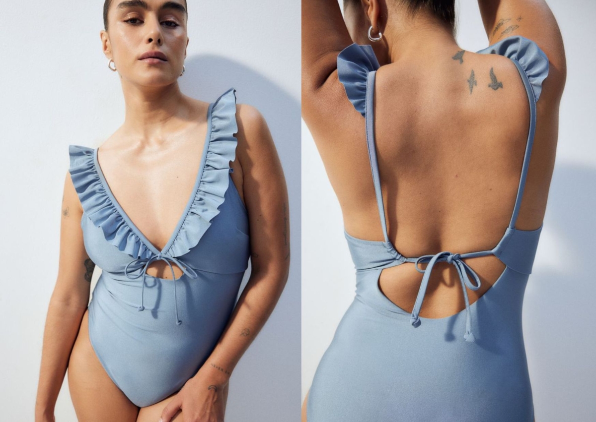 H&M 推出全新泳裝系列,其中這套全內裡連身泳裝,V領荷葉飾邊延伸至肩後,前胸中央小鏤空處配細綁帶,可調式肩帶穿過背面小圈環後綁結,罩杯有可拆式襯墊,具有塑形效果,提供良好支撐,讓洶洶更加圓潤有型,背面採半包臀效果,色系則是淡雅療癒的莫蘭迪藍紫色。