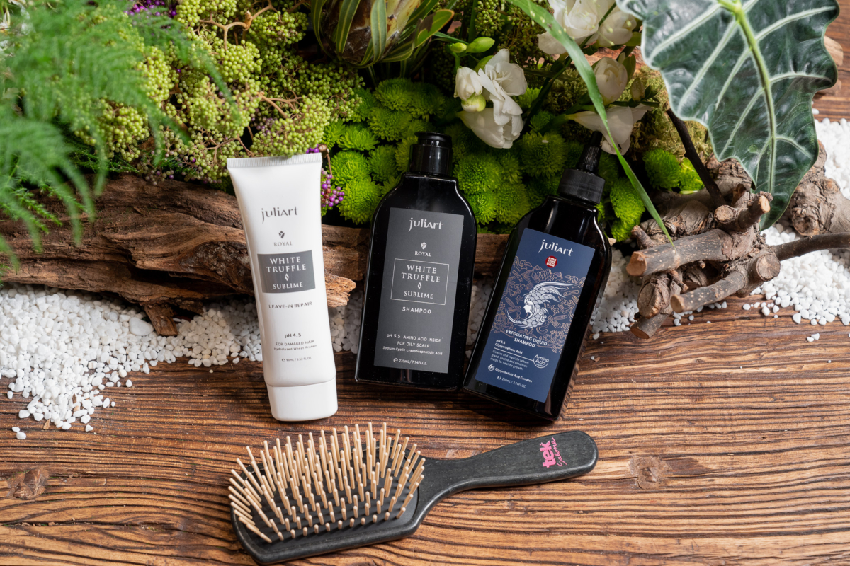 台灣氣候濕熱加上空氣汙染嚴重,頭皮日常若沒有正確清潔,表面未代謝油脂結合老廢角質和髒污,形成「固態油脂」堆積在頭皮表層與髮根,就會導致頭髮油膩扁塌、異味橫生,而最令人困擾的,莫過於使用一般洗髮精無法徹底清除。juliArt 明星商品「甘草次酸角質淨化液」萃取漢方中醫經典藥材「甘草」,將其活性成分結合現代髮肌保養技術,打造不含藥性成分的液態洗髮精,以甘草次酸複合物去除頭皮與髮根處的「固態油脂」,漸進式控油及調理頭皮,同時透過檸檬酸複合物溫和軟化頭皮老廢角質,改善頭皮毛孔阻塞問題,另亦添加地衣抗菌複合物,有效避免頭氣味產生,定期為頭皮大掃除,告別夏季油頭悶臭困擾。