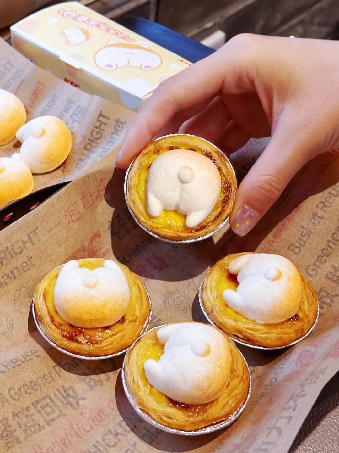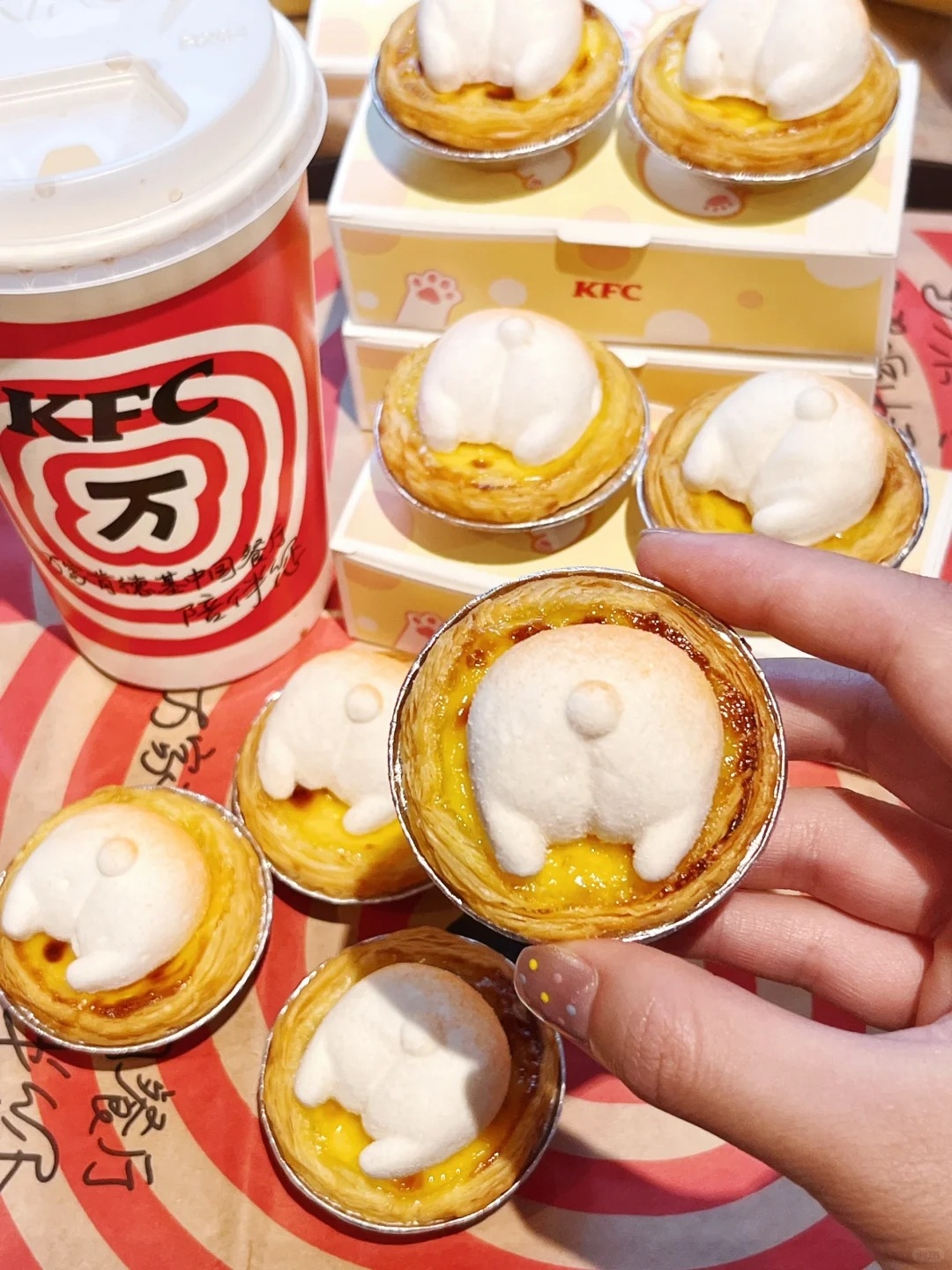 肯德基竟異想天開在蛋塔上做造型!肯德基推出蛋塔後一直是許多人必點的品項而成為招牌之一,如今蛋塔已經上市20年了,中國肯德基為了慶祝蛋塔20周年,特別推出「哈基米寶寶蛋塔」 ,在一般原味蛋塔上放上柯基屁屁造型棉花糖。