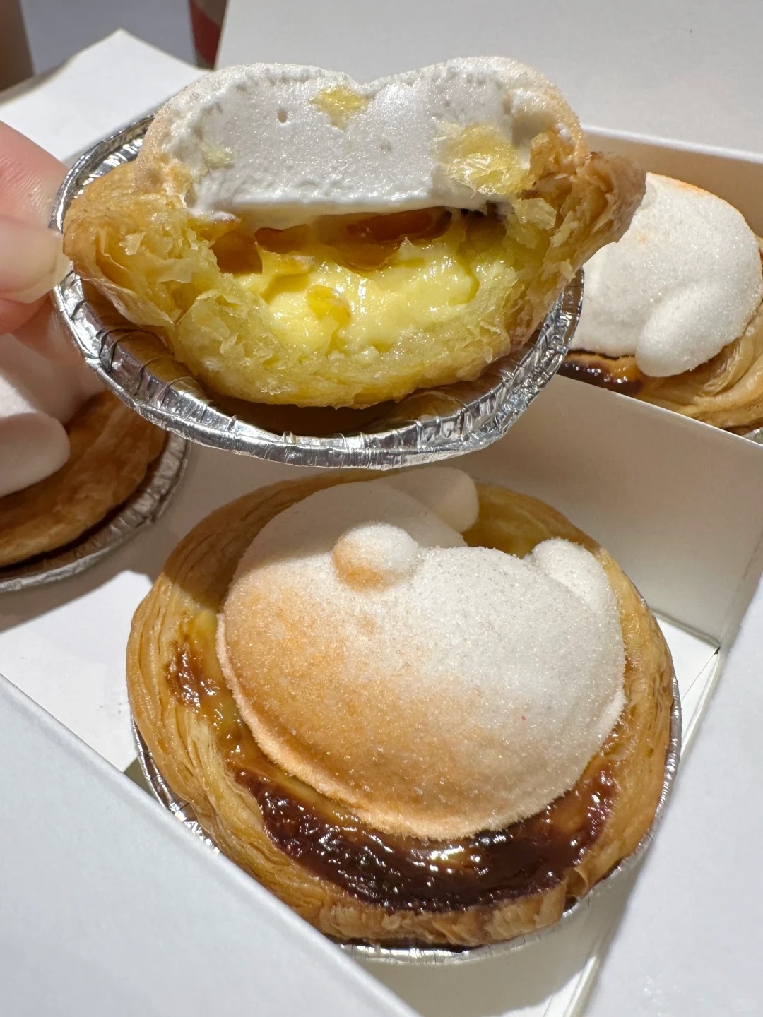 綿密厚實的棉花糖一口咬下去與蛋塔融為一體,爆漿的瞬間同時擁有兩種口感超滿足!不過因為蛋塔本身偏甜,再加上灑有糖粉的棉花糖,對一部分的人來說可能會覺得太甜,建議搭配能夠解膩的飲品一起吃~