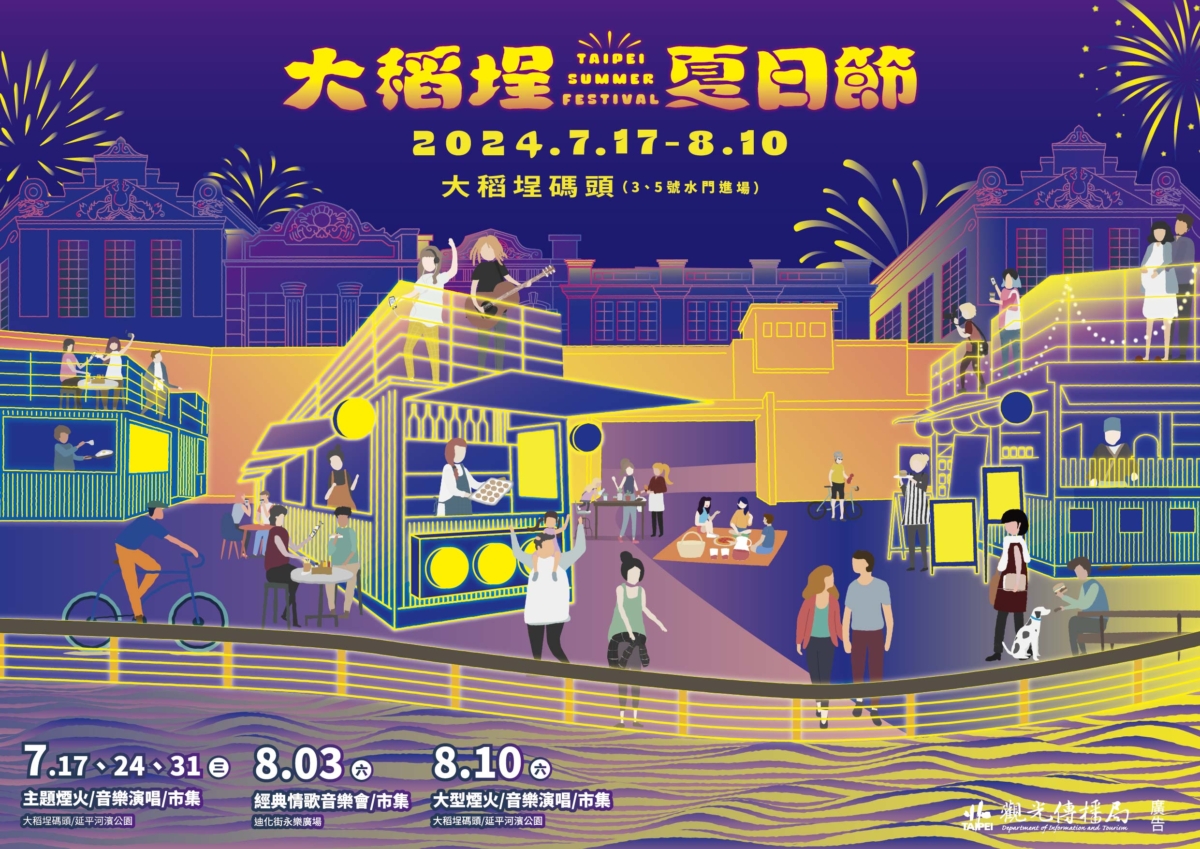 由觀光局舉辦的大稻埕夏日節一直都受到極大稱讚, 在大家的熱烈參與下,今年規模更是升級,7/17、7/24、7/31、8/10在「大稻埕碼頭」、「延平河濱公園」不但有可吃可逛的市集加入,還會邀請人氣歌手現場音樂演唱與精彩煙火秀。8/3則在「迪化街永樂廣場」有「經典情歌演唱會」及「大稻埕商圈限定文創市集」,期待大家一同度過浪漫夏日季節。
