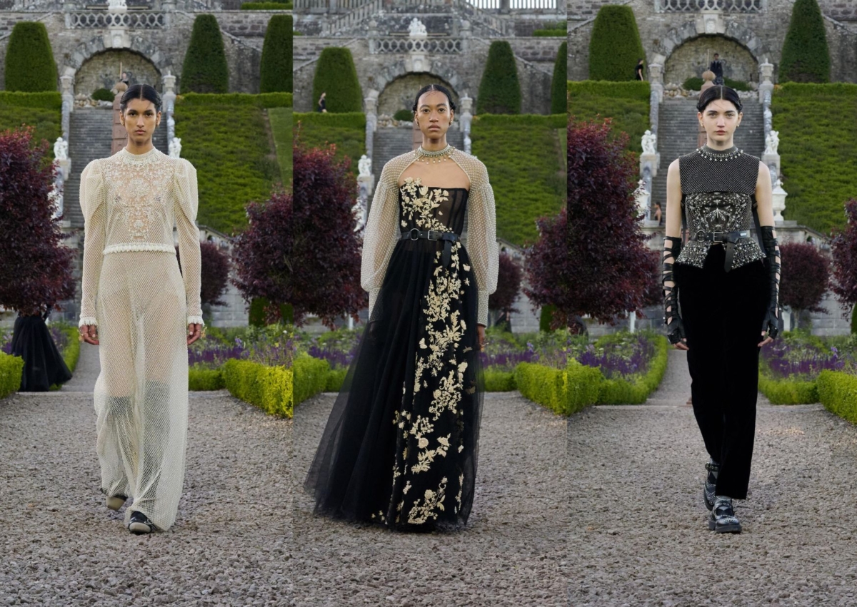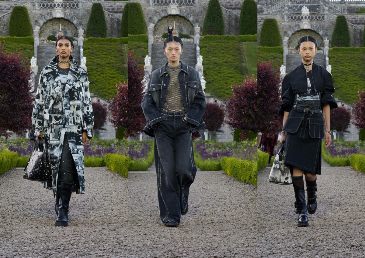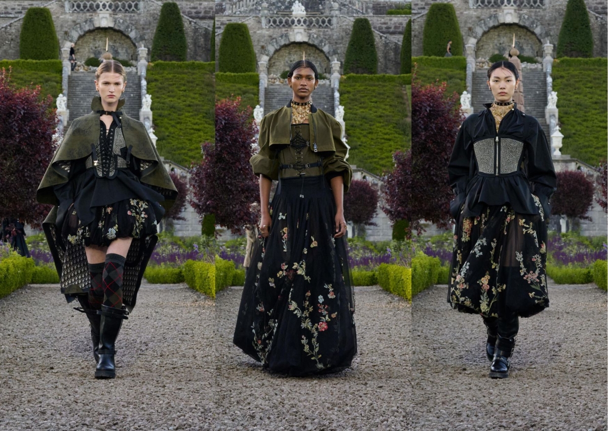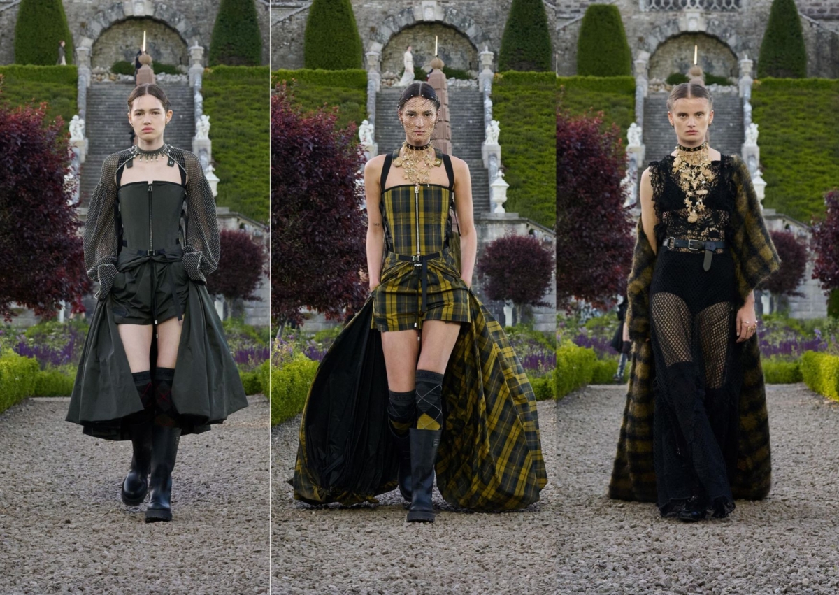 Dior 2025早春度假系列在蘇格蘭德拉蒙德城堡花園盛大舉行,以1955年迪奧先生蘇格蘭伯斯郡的發表會為靈感,格紋面料貫穿全系列,獨角獸、薊花、小碎花的千花紋樣,天鵝絨和蕾絲混搭,打造出現代馬術風格,華麗刺繡馬甲與打褶小洋裝,珍珠和蕾絲交織出一套套浪漫又叛逆的新氣息!品牌大使韓韶禧、安雅泰勒喬伊、珍妮佛勞倫斯、莉莉柯林斯和新木優子都來到現場,全以黑色系酷帥風稱霸全場!
