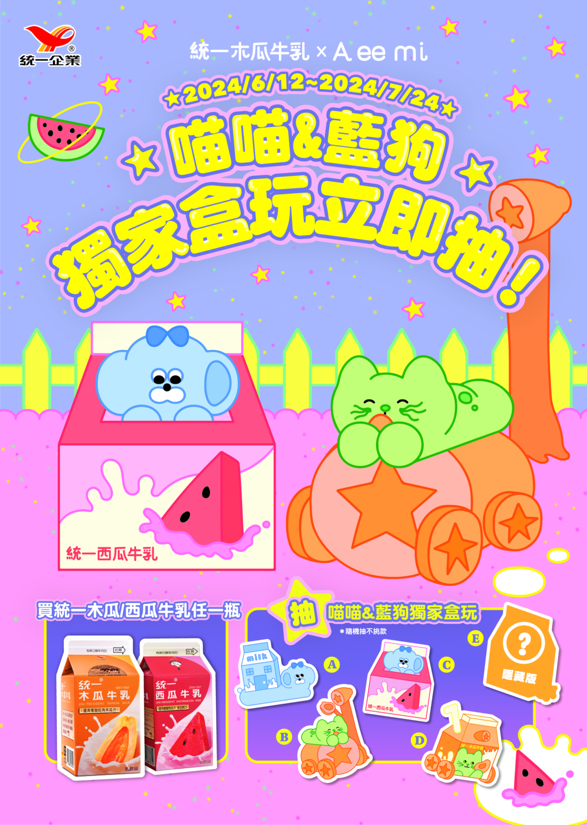 統一木瓜牛乳與A ee mi一同推出一系列五款(4+1款隱藏版) 喵喵&藍狗獨家盒玩,超萌超可愛又超有質感的公仔真的讓小編也忍不住想通通帶回家(先許願可以抽到隱藏版),只要在活動期間與好麻吉一起喝統一木瓜牛乳、統一西瓜牛乳,即可透過包裝上的活動貼紙掃QR code進入活動網站,再憑商品包裝上的活動貼紙序號,參加抽獎活動(活動貼紙數量有限,售完即止)。