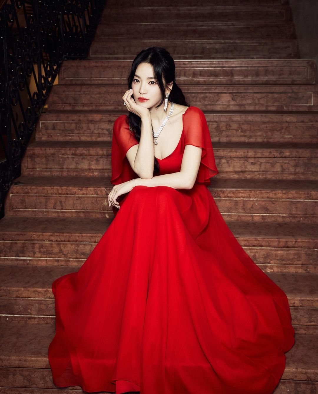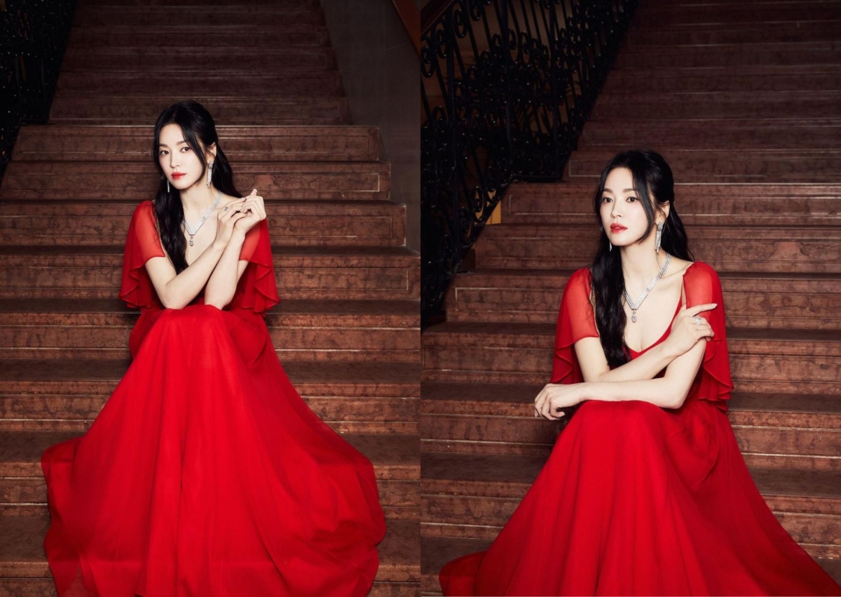 接著品牌大使宋慧喬在 Chaumet 晚宴上以一襲鮮紅色禮服亮相,搭配全新Chaumet Voltige 系列 18K白金項鍊、耳環和戒指,紅色雪紡紗材質微微露出肌膚,難得選擇這麼亮眼色系的造型,綁起公主頭捲髮造型,既霸氣又溫柔!Voltige 系列珠寶將傾斜、扭轉及扁平的金屬線條互相交織,鋪鑲鑽石在線條之間綻放火光,相互映襯珠寶的炫目光芒和凍齡女神的搶眼魅力。