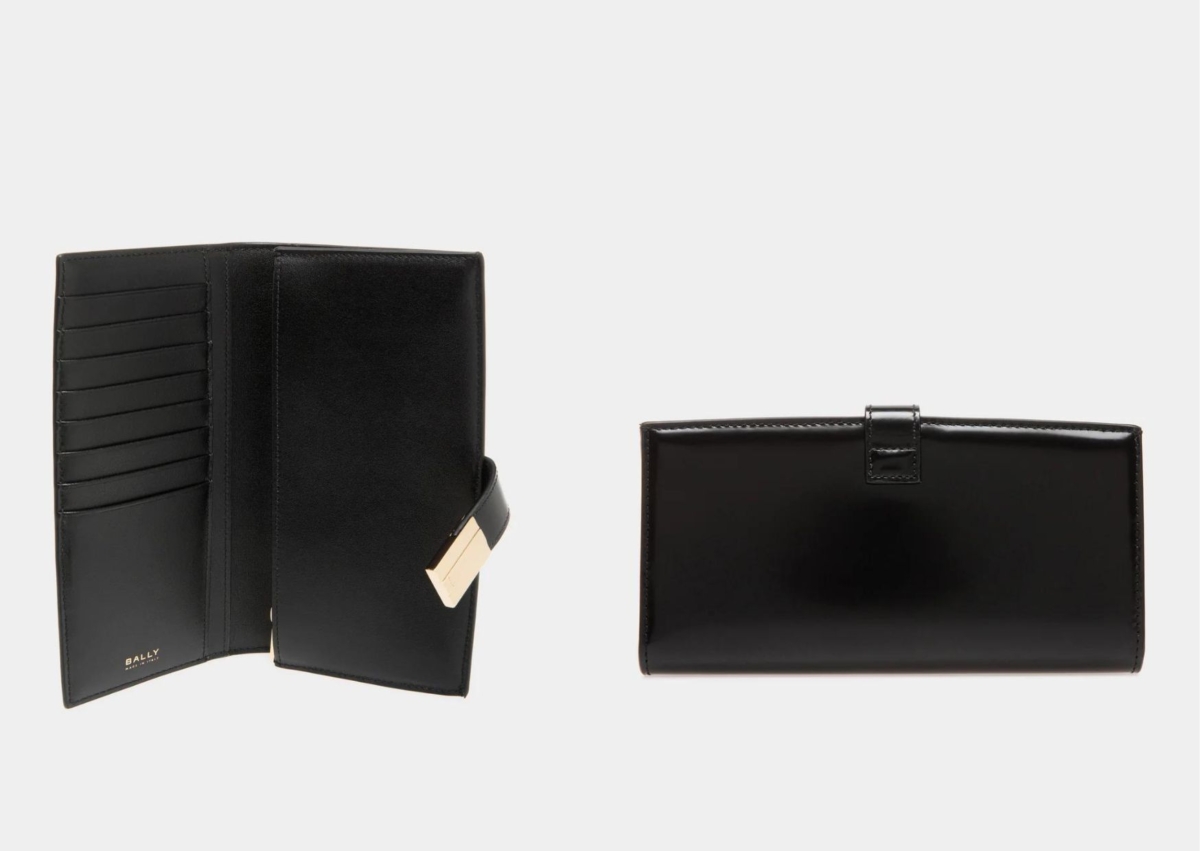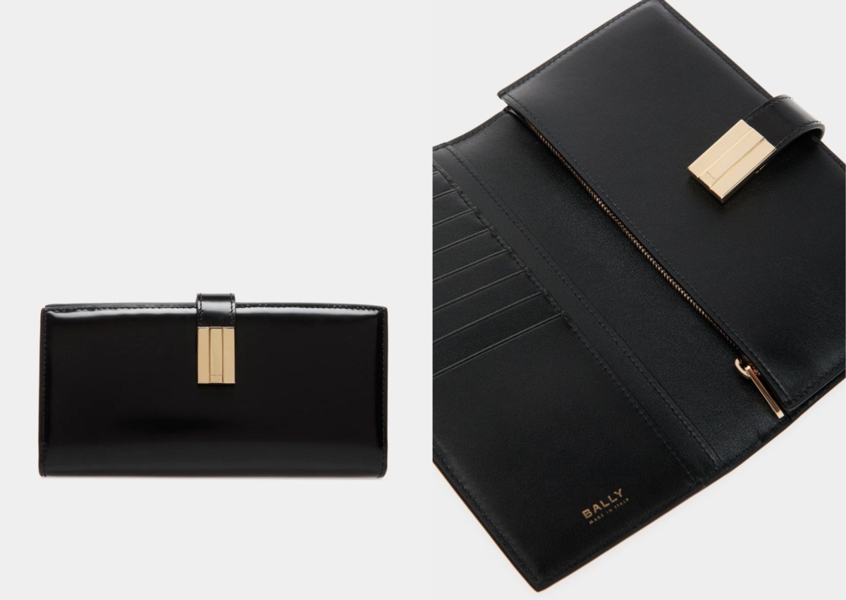 Bally Ollam 長夾相對較不同於其他款式的霧面設計,反而採用黑色亮面皮革製成,配有精緻 Bally Ribbon 五金釦飾,沒有彰顯的大 Logo,風格屬於叛逆酷帥樣式,外層和內層採用不同材質,有種碰撞衝突感,而內部同樣設有多個卡片夾層、零錢袋和鈔票層,價格也是甜甜好入手呢!