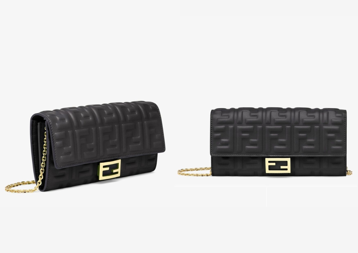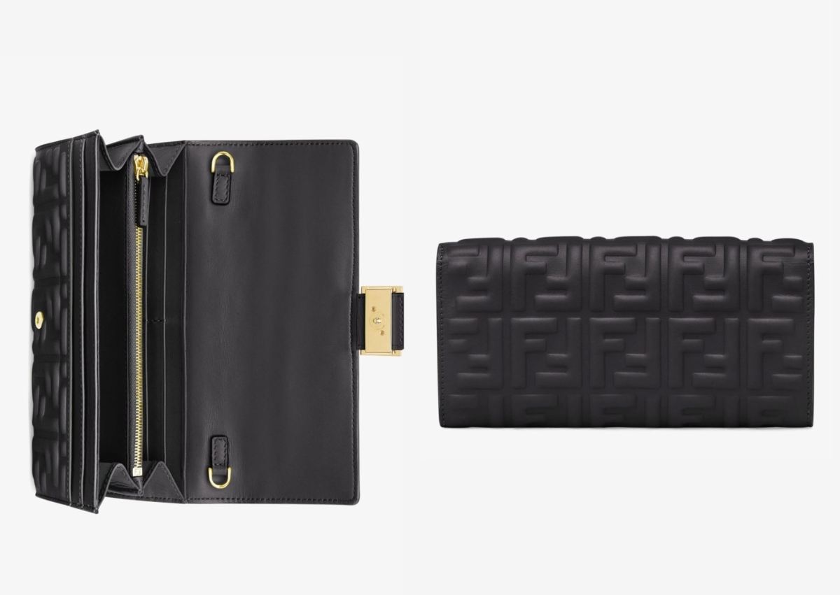 Fendi Baguette 也是品牌經典之作,將 Baguette 的標誌性特色放在皮夾上,採用黑色納帕皮革製成,飾有浮雕 FF 主題圖案,鍍金處理的金色Logo和扣飾,內裡是仿皮夾設計,有兩個角撐式隔層、一個拉鏈口袋、平底口袋和十個信用卡夾層,這款長皮夾也附有可拆卸細鏈肩帶,當作小包揹上身也超可愛又好看!