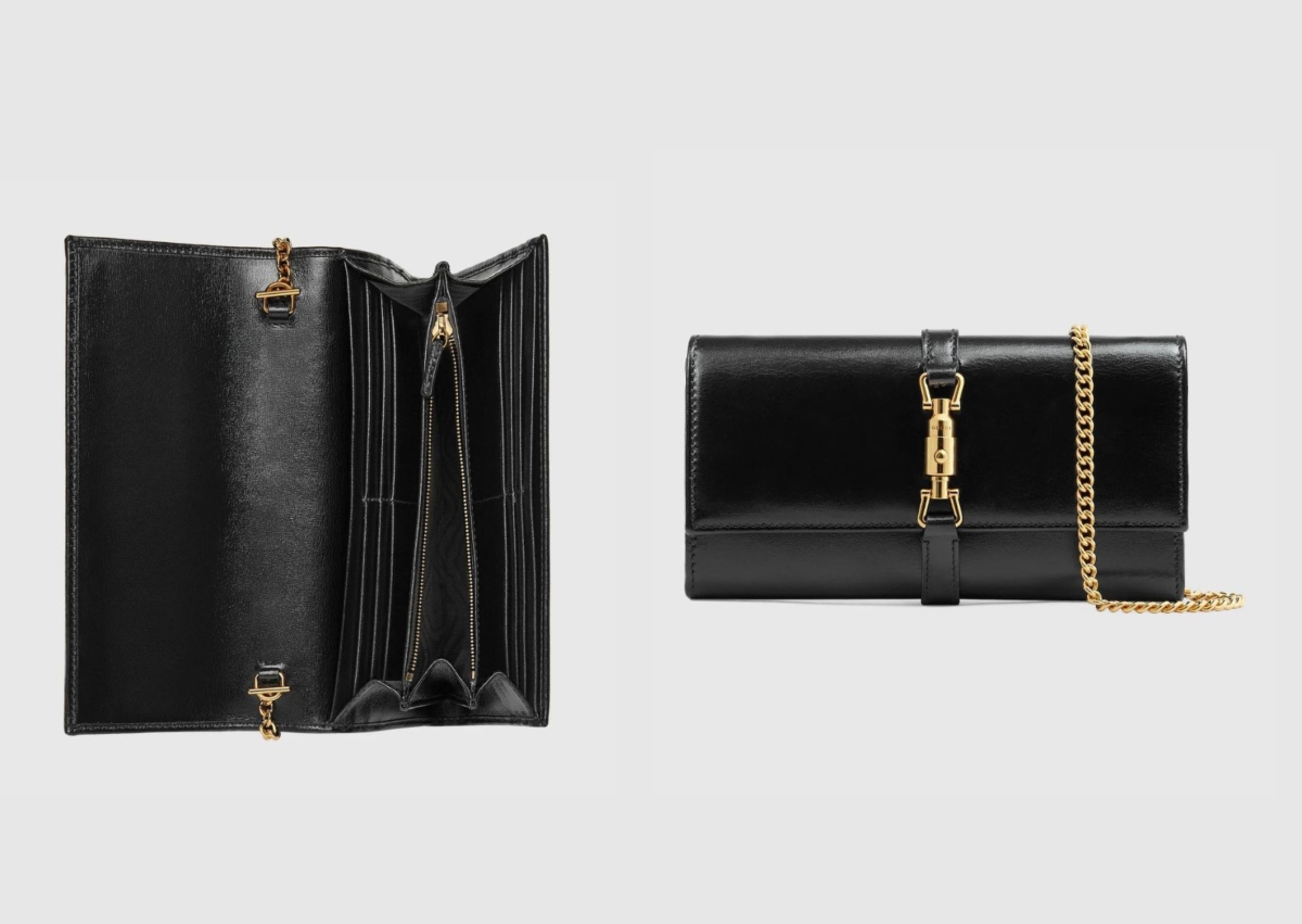 這幾年的大勢包款 Gucci Jackie 1961,早在1958年就已問世,經歷60幾年的時間淬鍊仍歷久不衰,不少明星、名人都超愛揹!Jackie 1961 也有推出「長皮夾」款式,長夾採用黑色皮革製成,將標誌性鎖扣完美應用在皮夾上,搭配金色五金配件,設有十二個卡片夾、二個鈔票隔層、二個獨立的內部隔層和拉鍊零錢袋,另外還附有長度 60 公分的鏈帶,不只可以當作皮夾,還可以調整成斜揹變成迷你小包,一包兩用太實用!