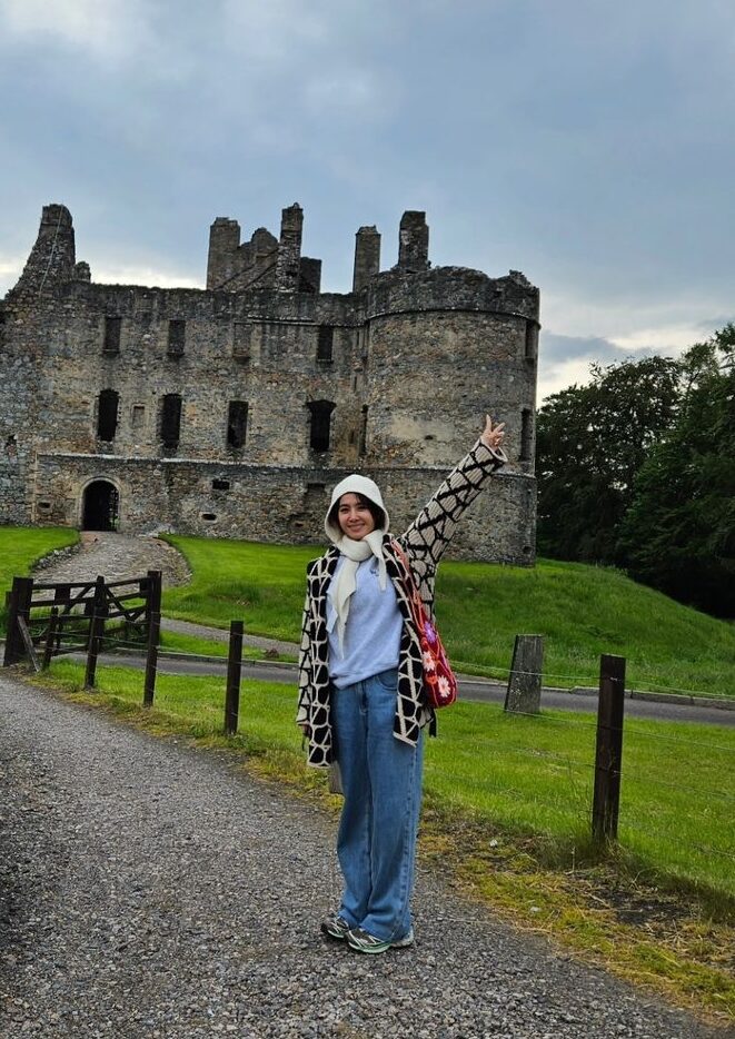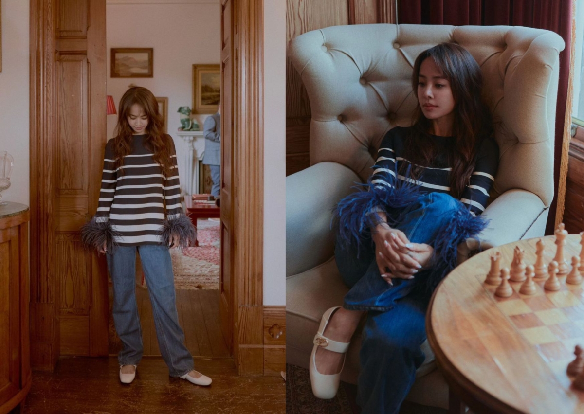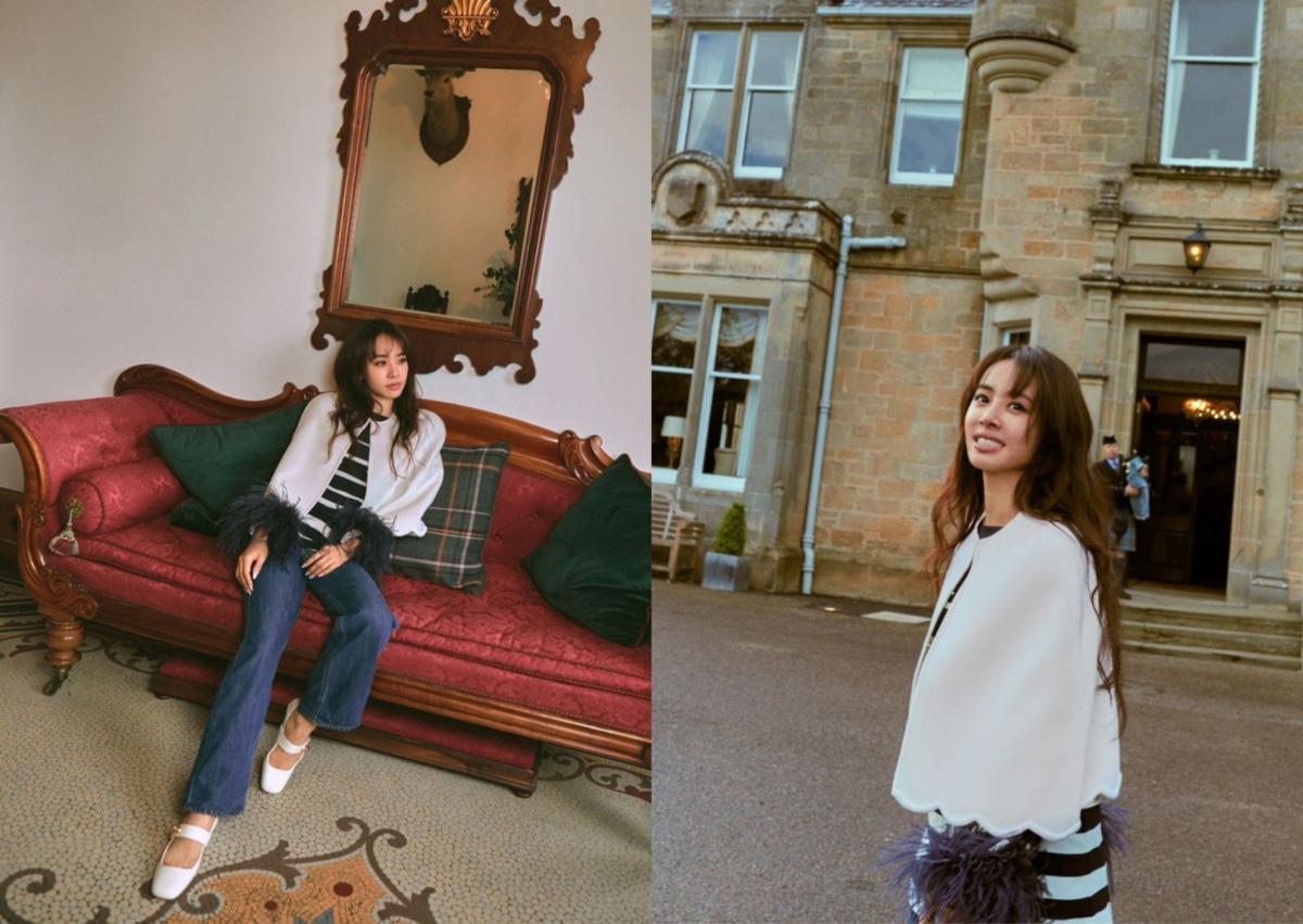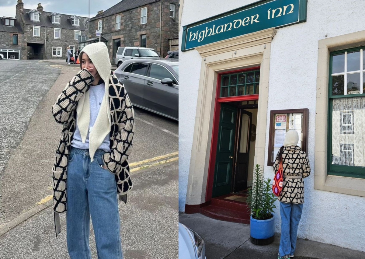 這次來到蘇格蘭旅行,Jolin 身上的穿搭造型自然是不能忽視,穿上多套她代言的品牌 Valentino,首先這套率先登場的造型來自 Valentino 2024 早秋系列的黑白色條紋針織上衣、寬鬆牛仔褲和 V Logo Oversize 西裝外套,披著慵懶長捲髮,呈現學院風的穿搭造型,彷彿剛上完課出來放風的學生!