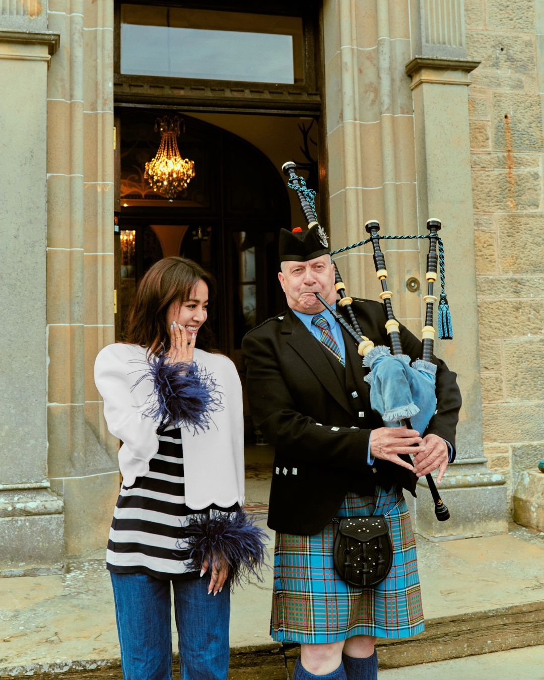 蔡依林 Look 3 穿搭可以看到她身旁站著一位穿著蘇格蘭傳統服飾、吹個蘇格蘭風笛的人,兩人開心談笑著欣賞樂曲,蔡依林則是身穿 Valentino 2024 早秋系列深藍紫色混白色條紋羽毛針織衫、牛仔褲,外搭一件白色小外套,整體造型地典雅又不失個性,袖口的羽毛設計更注入了一股時髦感,腳上搭配一雙白色瑪莉珍鞋,呼應身上外套配色。