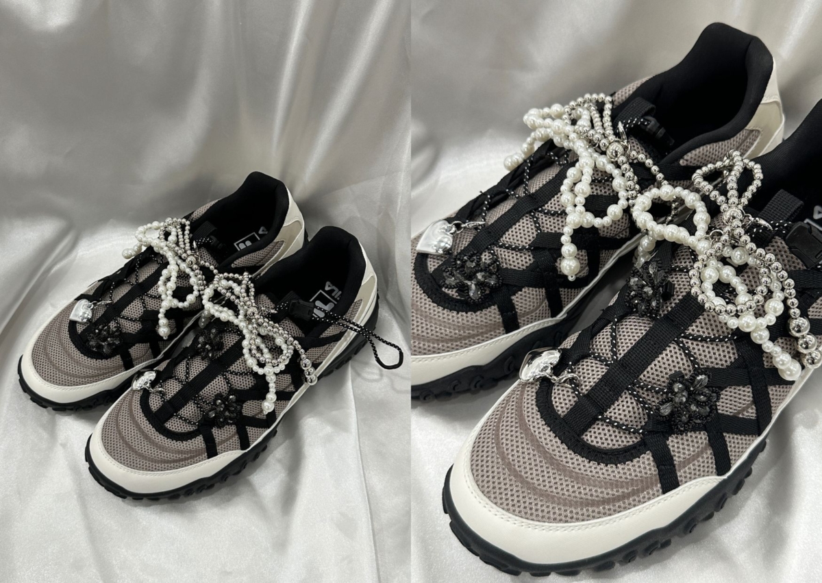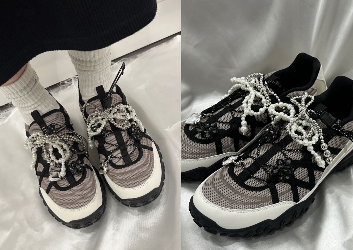 第二雙是挑選近期話題性很高的 FILA Echappe Lace 中性棕色免綁鞋帶運動鞋,自從韓紹禧成為代言人、拍攝新一季的FILA夏季形象,韓韶禧腳上這雙芭蕾運動鞋款「ECHAPPE LACE」引起韓妞追捧,瞬間造成一陣熱潮!棕色網底搭配黑色絲帶交織,加上運動風釦帶,編輯選擇搭配選品店 RNEEA 韓國鞋帶扣裝飾吊墜珍珠蝴蝶結、黑色小花扣,再加上銀色蝴蝶結和銀色愛心,為整體注入一絲叛逆感!