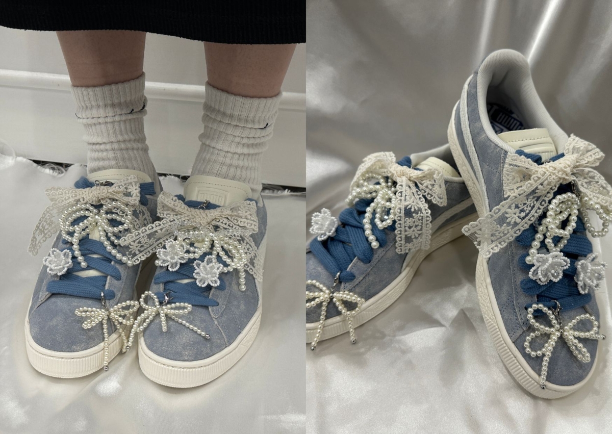 最後一雙編輯選擇少女們最愛的張員瑛同款 PUMA Suede Forever Dance,淺藍色配色讓人看了好療癒,麂皮鞋面帶有溫柔感,特別挑選選品店 RNEEA 韓國鞋帶扣裝飾吊墜,這雙搭配以蕾絲蝴蝶結為主,珍珠雙層蝴蝶結點綴,搭配白色小花和小款珍珠蝴蝶結,可以說是整體最少女的一款配色了!