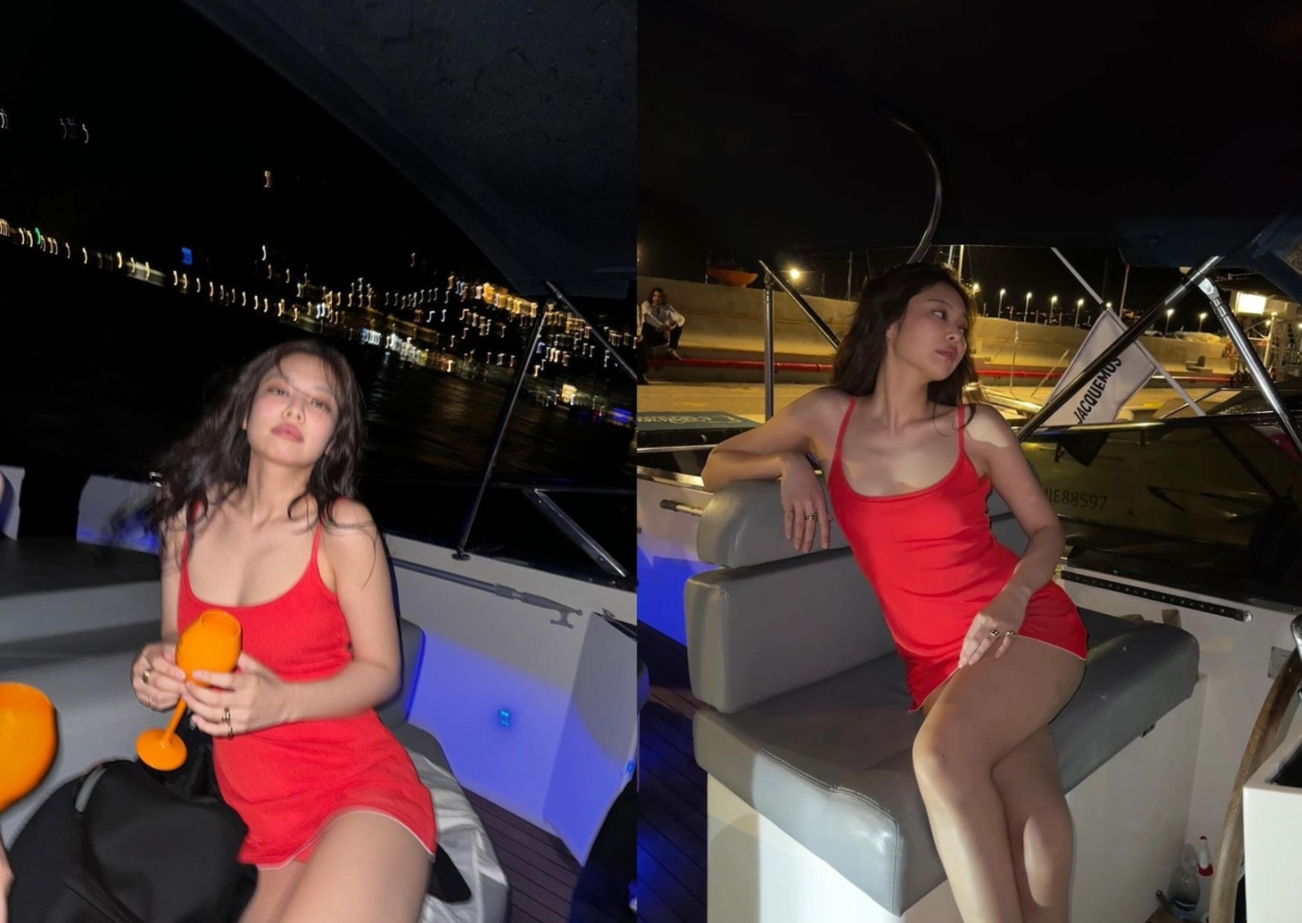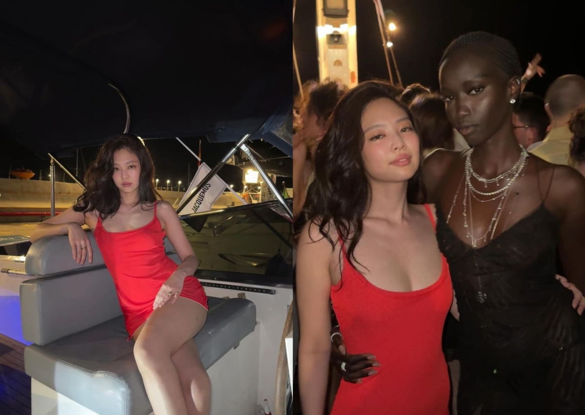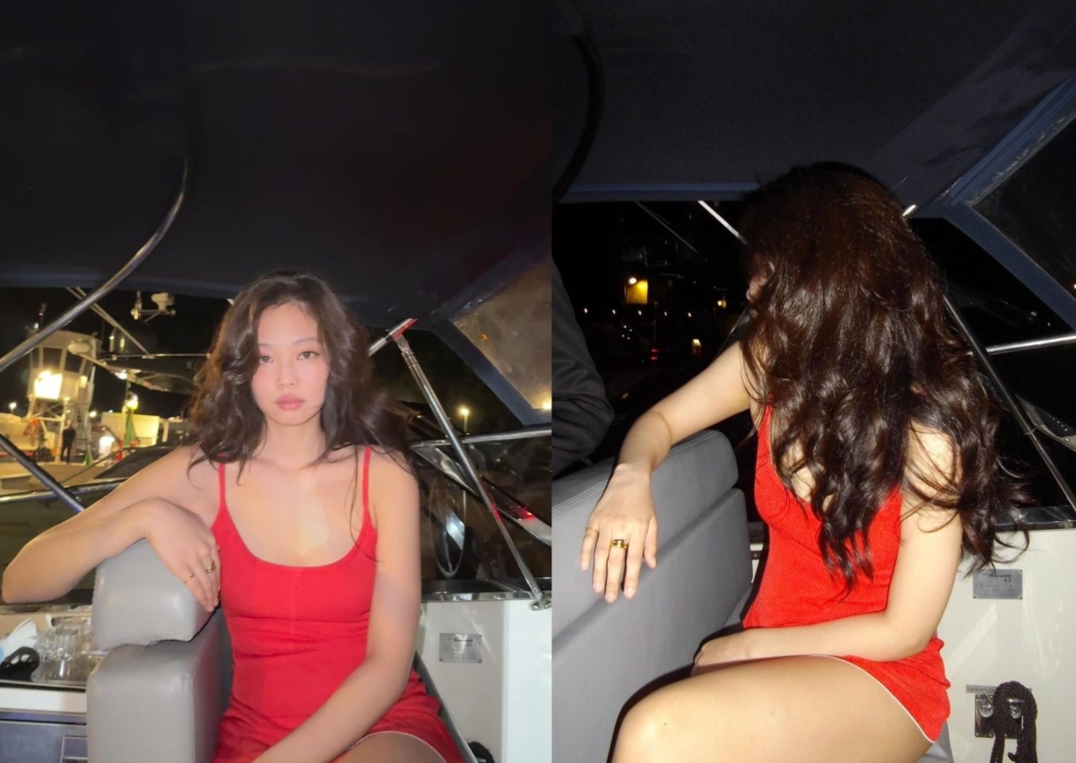 Jennie 晚上來到 Jacquemus 舉辦的遊艇派對,換上同樣來自Jacquemus La robe maille Roupao 的橘紅色迷你連衣裙,以針織彈性面料製成,貼合身體曲線,採扣式襠部設計,背面縫有漁夫徽標標籤,Jennie 一頭浪漫波浪捲髮搭配微醺妝容,別有一股港式復古風情,跟另一套黑色連身裙有完全不同的造型感。