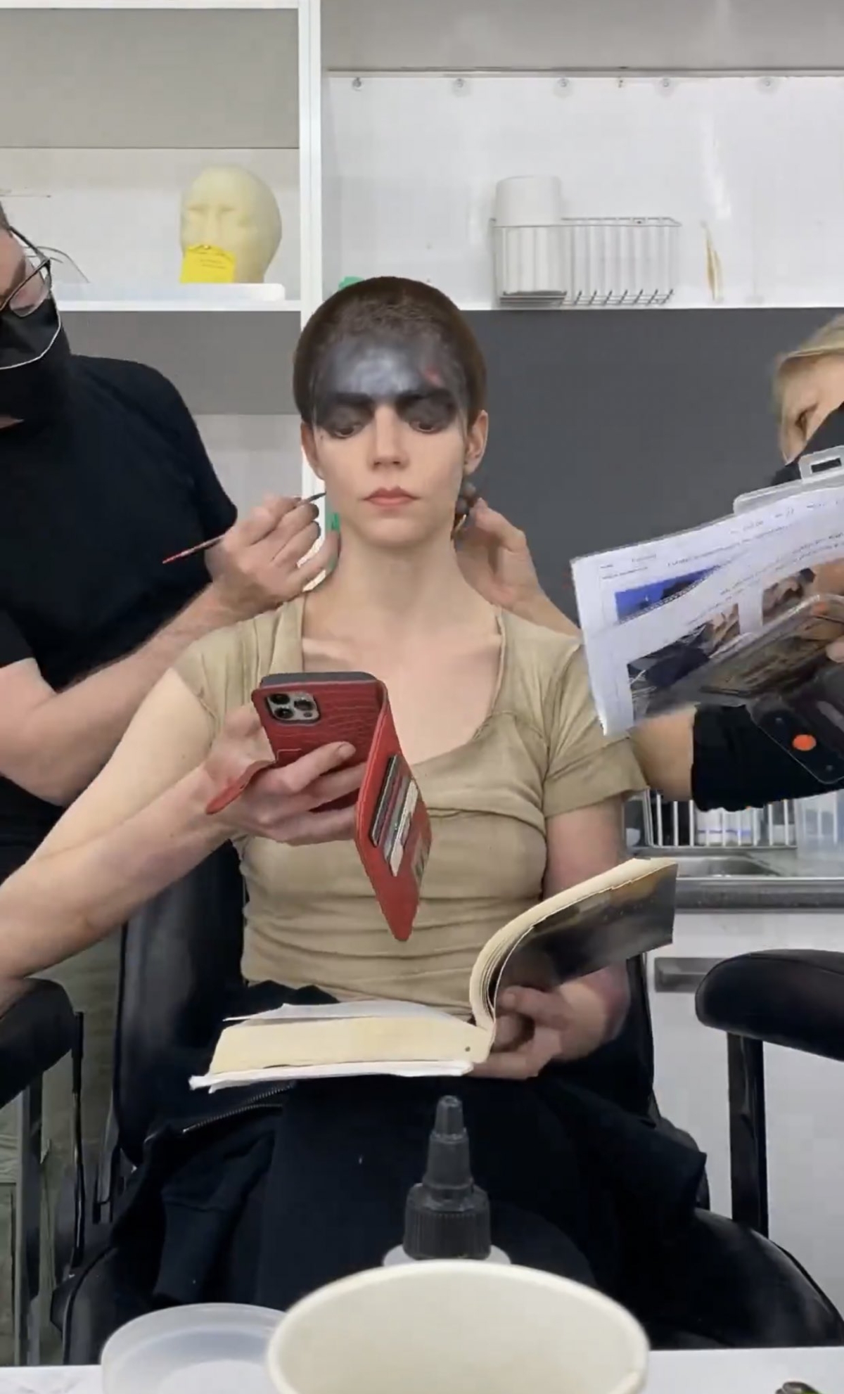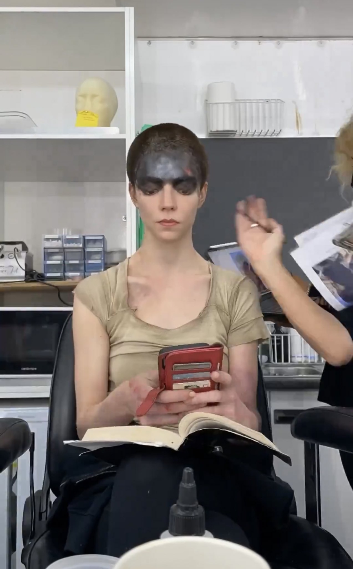 安雅泰勒喬伊到底還有什麼讓人驚訝的趣事啦XD 近日有韓國網友在論壇上,分享安雅泰勒喬伊在《芙莉歐莎:瘋狂麥斯傳奇篇章》的拍攝狀前準備花絮照片,安雅泰勒喬伊靜靜的坐在位子上讓化妝師上妝,在等待期間她不斷滑手機。