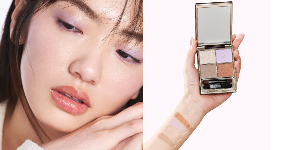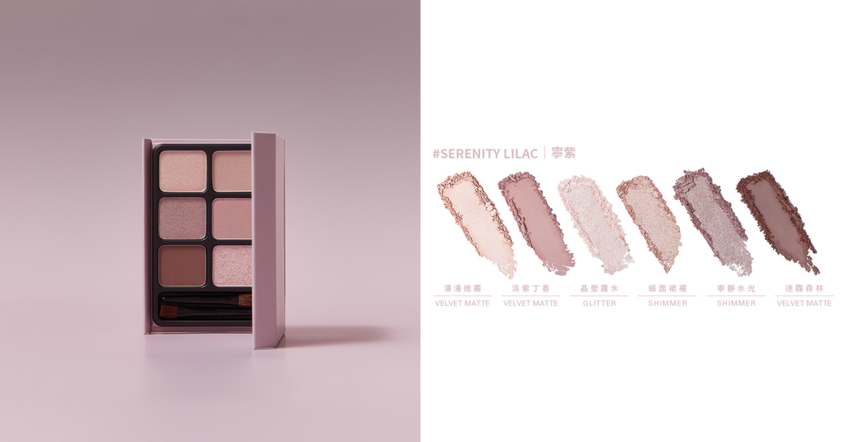 寧紫以寧靜晚霞為主題,使用粉紫色調營造絢麗卻靜謐的氛圍,粼粼波光與碎鑽亮片相呼應,更加迷幻內斂。眼影結合絲絨霧面、細緻珠光、及閃耀亮片三種質地,粉體細緻服貼好暈染,新手女孩也能輕送打造出淡雅的日常妝容。