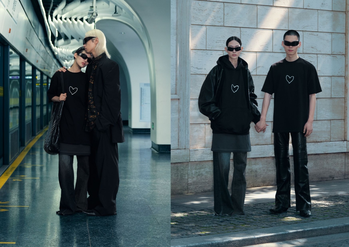 Balenciaga 發表七夕24系列限定產品與廣告大片,找來多對熱戀中情侶穿上系列服飾,在餐廳、街邊、植物園與地鐵站共度甜蜜時光,攝影鏡頭下,多款配飾以看似不經意的形態,鬆弛地懸掛和放置於城市街景之間。系列單品包括飾有白色、紅色手繪愛心黑、粉色經典款 T-shirt 和連帽衛衣,以及黑色、奶油灰白色的全幅塗鴉印花牛仔夾克、短褲、迷你裙和長褲,揹上 Explorer、Le City 和 Monaco 包款,都採用淡紫色填充尼龍、漂白塗鴉黑色工業尼龍等節日限定配色、材質。