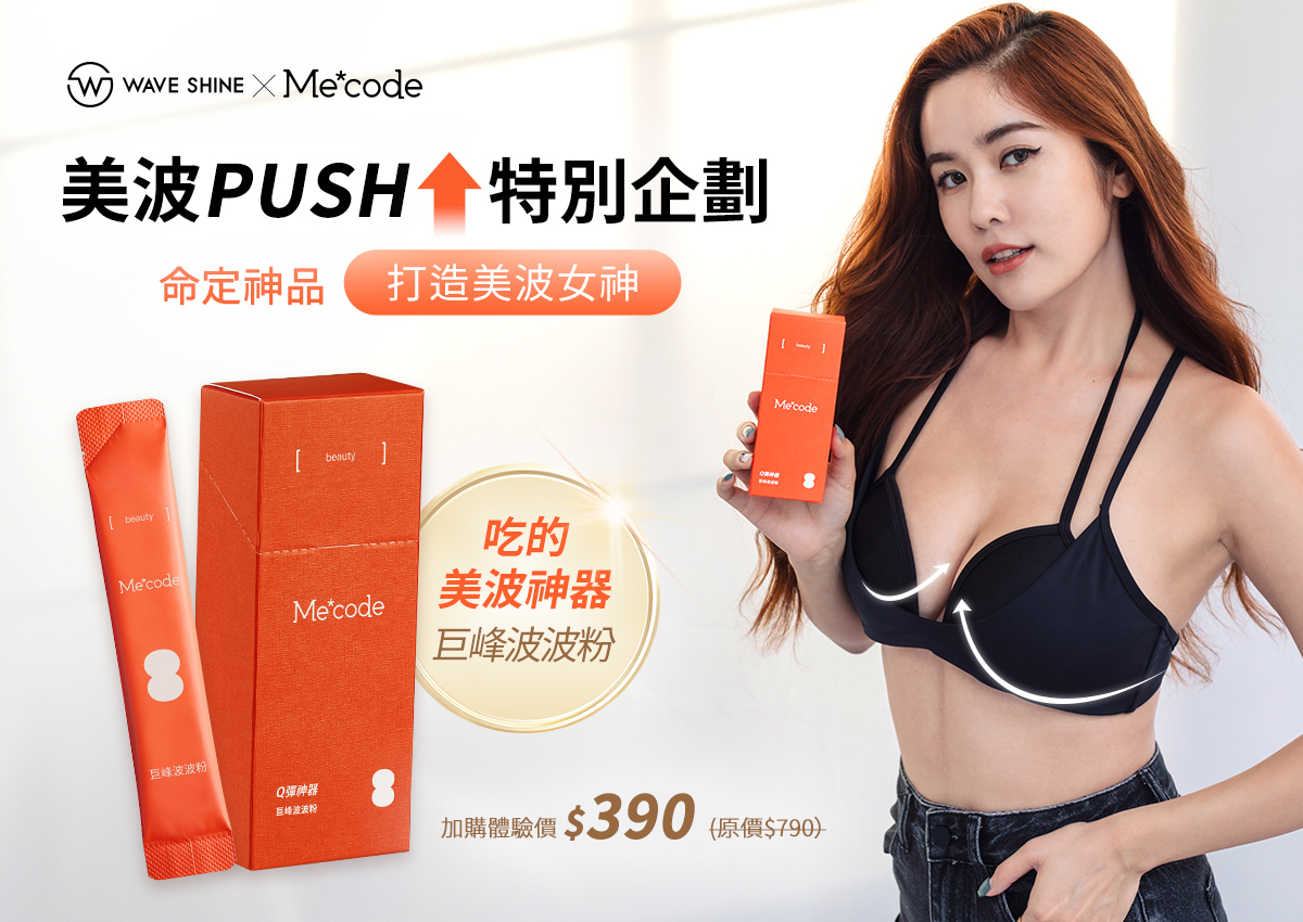 Wave shine官網任選一件挺波衣或泳裝,限時加購$390就送「Me*code巨峰波波粉」,「外穿X內服 加倍挺∙穩∙大」,最佳入坑時機就是現在!網友激推回購寶藏CP組合絕對必敗!