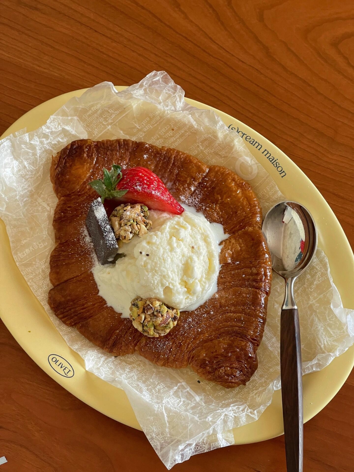 創意扁可頌源自於韓國,將原本香酥鬆脆的可頌壓扁,變成口感扎實酥脆的「餅乾」,外皮炙烤過的糖蜜帶點焦香,一開始小編想說就只是單純被壓扁的麵包,沒想到超級好吃!推出就受到大家的熱烈歡迎,搭配濃郁冰淇淋更加美味~