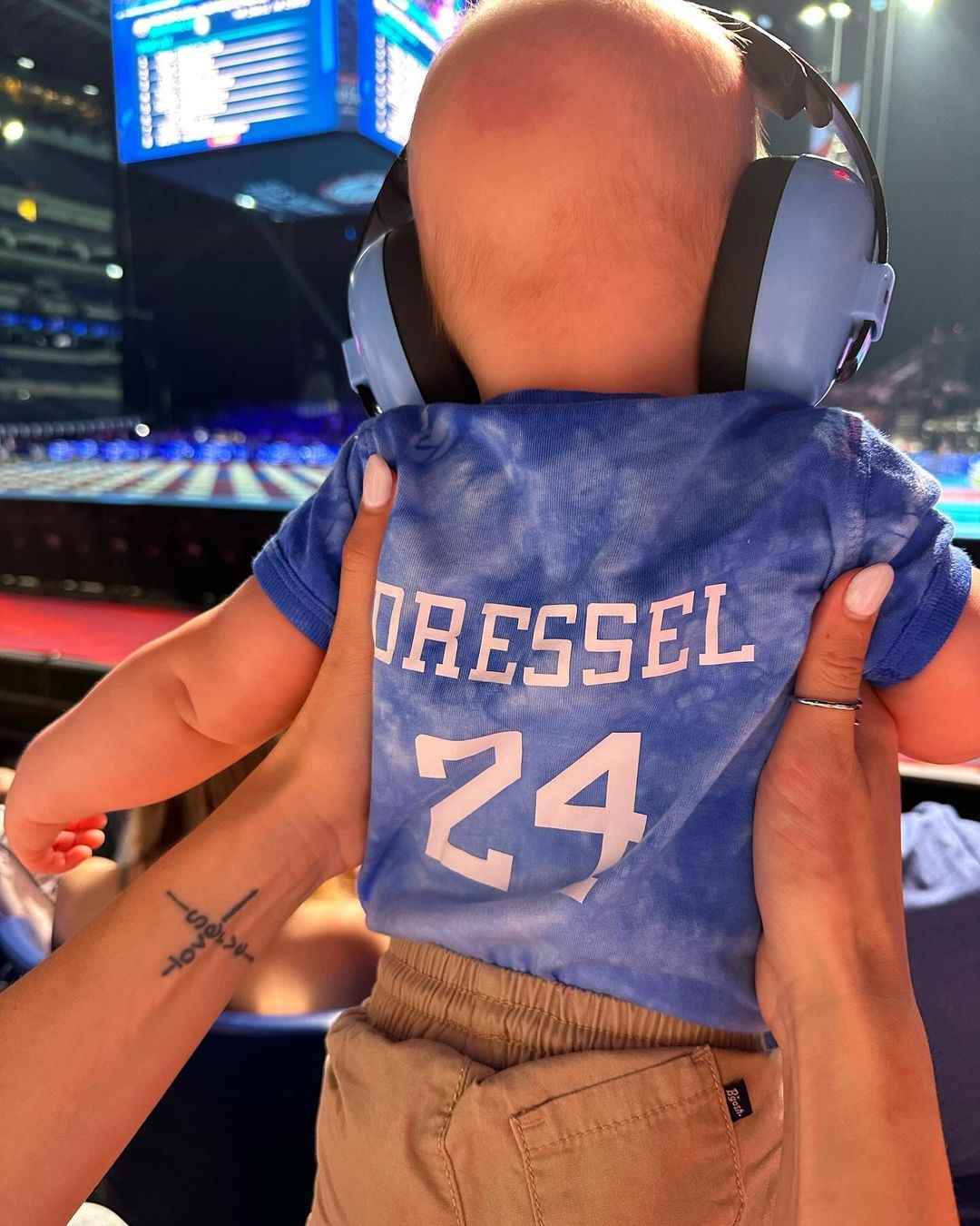 梅根帶著與剛滿五個月半的小寶貝奧古斯特在場邊為爸爸加油,擔心小Baby會被現場觀眾的加油聲嚇到,貼心為寶貝準備耳罩,奧古斯特穿上印上爸爸卡勒布·德雷塞爾 (Caeleb Dressel)姓名與背號的加油服,化身最萌加油團,也成為場上年紀最小的觀眾。