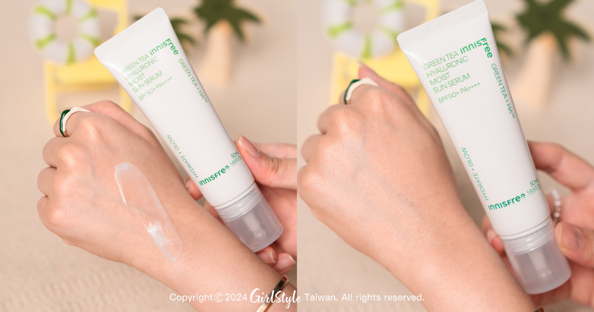 INNISFREE全新推出的《綠茶玻尿酸保濕防曬精華》將防曬效果結合明星產品綠茶保濕精華的爆水能量,使用玻尿酸膠囊科技並添加高達 83%的保濕精華成分,宛如保養品一般的輕盈水感的質地也是這次推薦中最輕透的一款。雖然沒有潤色效果,但立即吸收、乾淨成膜不泛白的特性,妝前使用可與肌膚完美融合,也能幫助持妝,讓女孩們都能從容的面對夏日高溫。