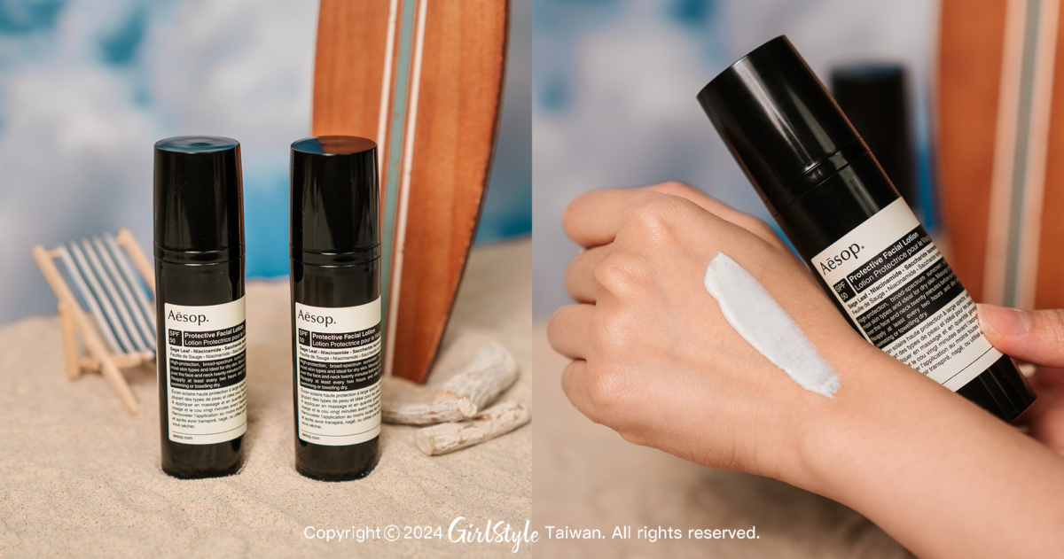 Aesop 防曬面部乳液以油溶性、水溶性的化學防曬成分調配而成,內含菸鹼醯胺、潤濕性保濕成分鎖水磁石,在為肌膚防曬的