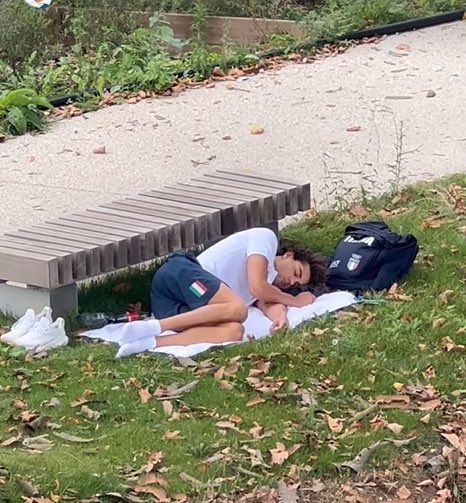 寧願睡外面!「義大利最性感游泳選手」Thomas Ceccon在選手村公園路邊午睡,辛酸畫面網瘋傳