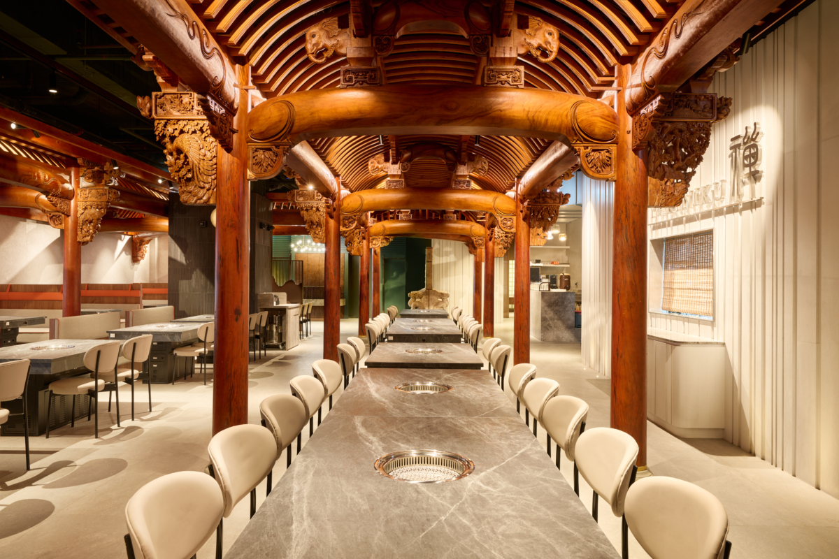 「禪燒肉」餐廳坐落於高雄一座美麗的銀杏木四合院內,這個歷史地標完美保留了原建築的風貌。為了營造古色古香的用餐氛圍,餐廳裝潢斥資六千萬,融合江浙四合院的概念,彷彿隱匿於城市中的靜謐秘境。四合院選材講究,主結構使用不易開裂的銀杏木,搭配具有驅蚊、醒腦功效的香樟木雕刻,走進店裡即聞到微微清香。