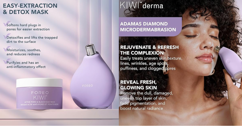 夏天最煩人的就是容易因為毛孔阻塞,時不時產生討厭的粉刺了~「FOREO KIWI 微晶磨砂黑頭儀」可以一次解決肌膚的多種問題!3種鑽石微晶磨砂吸頭可以去除死皮細胞,促進健康肌膚更新,改善肌膚疤痕瑕疵、色素沈澱和衰老的狀況~還有T-Sonic™垂直透膚聲波脈動透過按摩在短時間內打開毛孔,同時搭配完美校準的真空吸力能溫和有效地幫你從深層吸出多餘油脂和黑頭!搭配著清顏凈肌泥膜一起用,可以更快速凈化肌膚呦!有了這台以後,使用其他保養品就能把保養成分送到皮膚更深處,達到保養的最佳效果了~