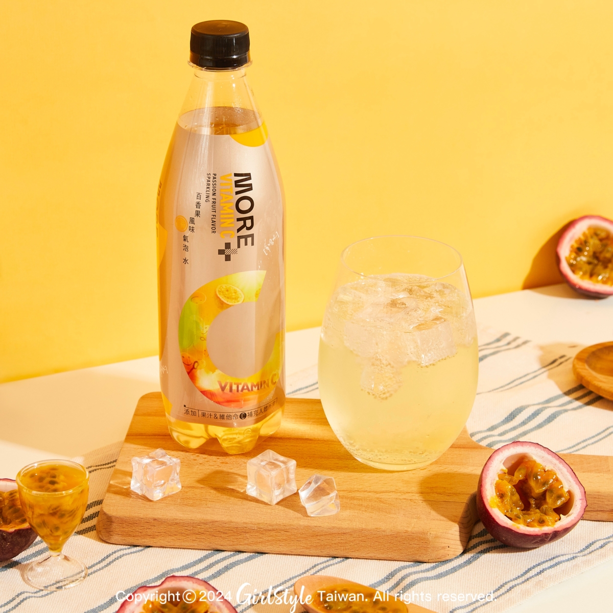 除了乳酸菌風味,還有另一款添加果汁的多喝水「MORE+維他命氣泡水-百香果風味」!一開瓶就有百香果香氣撲鼻而來,裡面還有維他命C、B3與B6,給你滿滿元氣活力,盡情享受清新果香與綿密氣泡口感!