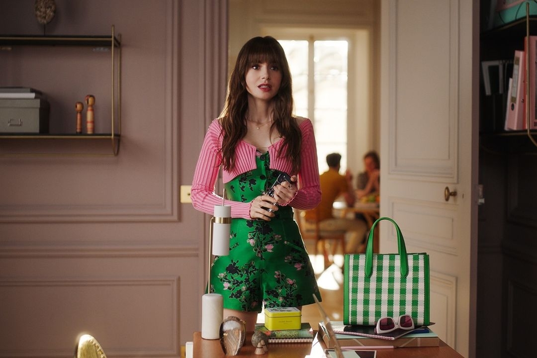 《艾蜜莉在巴黎》第四季第一集開播,就率先看到艾蜜莉以一身 Philosophy Di Lorenzo Serafini 綠色短褲套裝亮相,外面穿上 Jacquemus 粉色開襟衫,整體穿搭走鮮豔撞色風格,襯托她活潑積極的個性,一旁搭配 Kate Spade 綠色格紋手提包作為點綴,腳踩 Nodaleto Bulla Camille 白色皮革高跟鞋,一出場就留下深刻的穿搭印象。