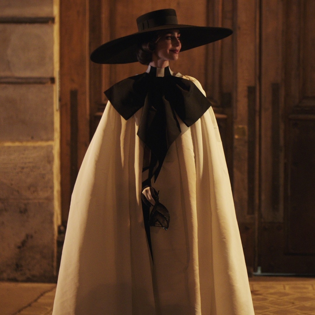 《艾蜜莉在巴黎4》化妝舞會中,艾蜜莉身穿一件黑白條紋連身衣、黑色裙擺搭配浮誇大帽子及面具,頂著復古短捲髮與煙燻妝容,一出場勢爆棚,而這一套造型服裝設計師 Marylin Fitoussi 提到是參考了奧黛麗赫本在電影《窈窕淑女》中的造型,帶有經典雋永氣息和神秘感,這套稱為本季重點穿搭,很適合「復仇造型」!