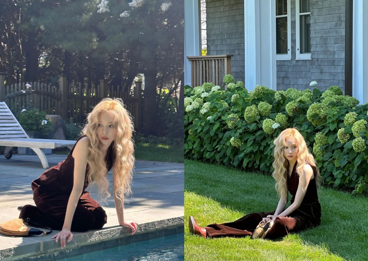 在 Ralph Lauren 2025 春季大秀秀後, Winter 褪去飄逸長裙,緊接著換上一套 Ralph Lauren 棕色絨布V領連身裙,整體看起來俐落、有個性,紅棕色搭配金色長捲髮,色調既柔和又協調,穿梭在樹林間、草地上和泳池旁,呈現俏皮空靈感,和秀上造型有不同感覺。