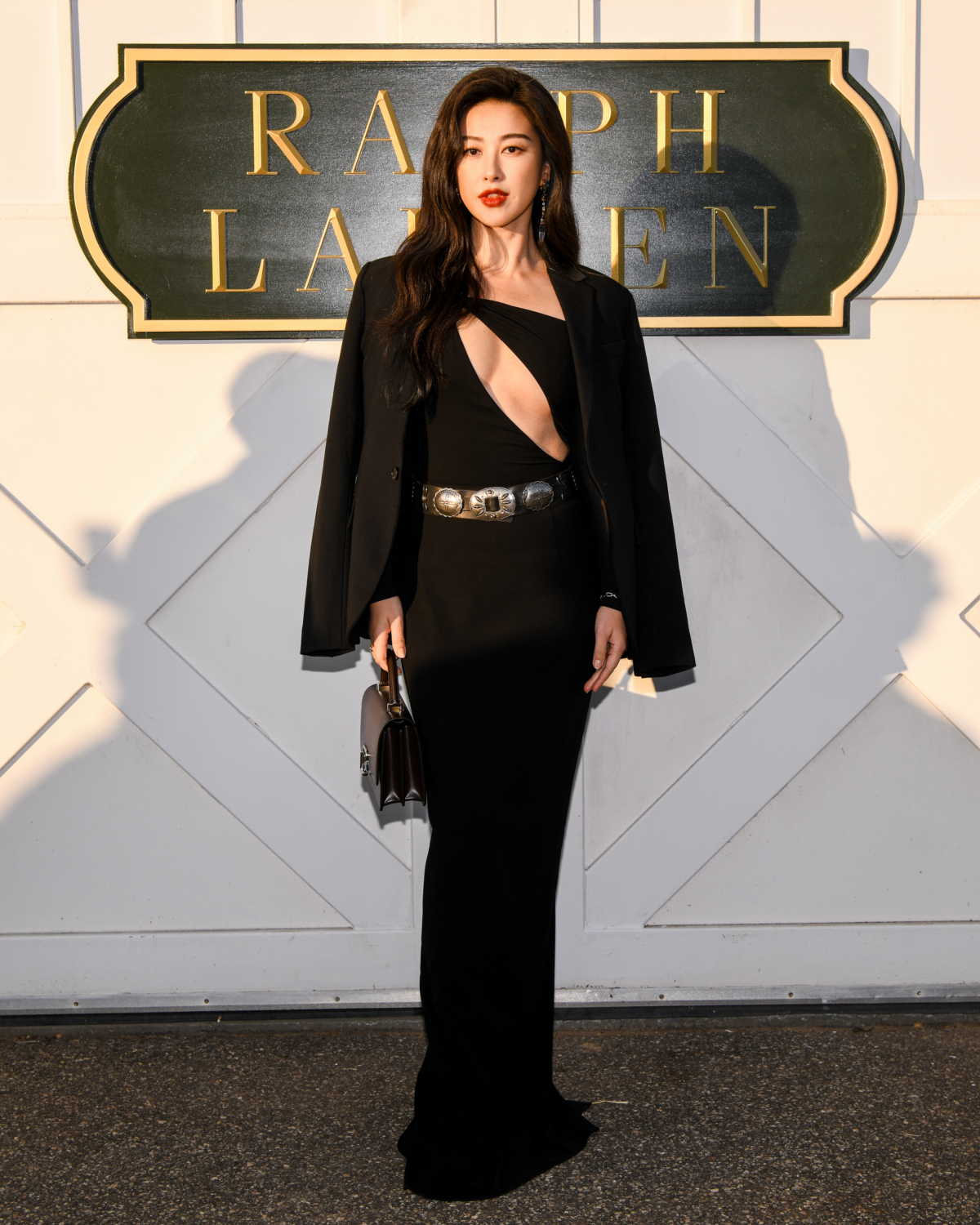 中國女演員朱珠這套簡直辣翻全場,身穿黑色連身裙現身 Ralph Lauren 2025 春季大秀,從右胸拉至左腰間的鏤空設計超級性感,採用魚尾感裙擺設計,加上寬版金屬腰帶,讓身材曲線更加搶眼,外搭黑色西裝外套、若隱若現。