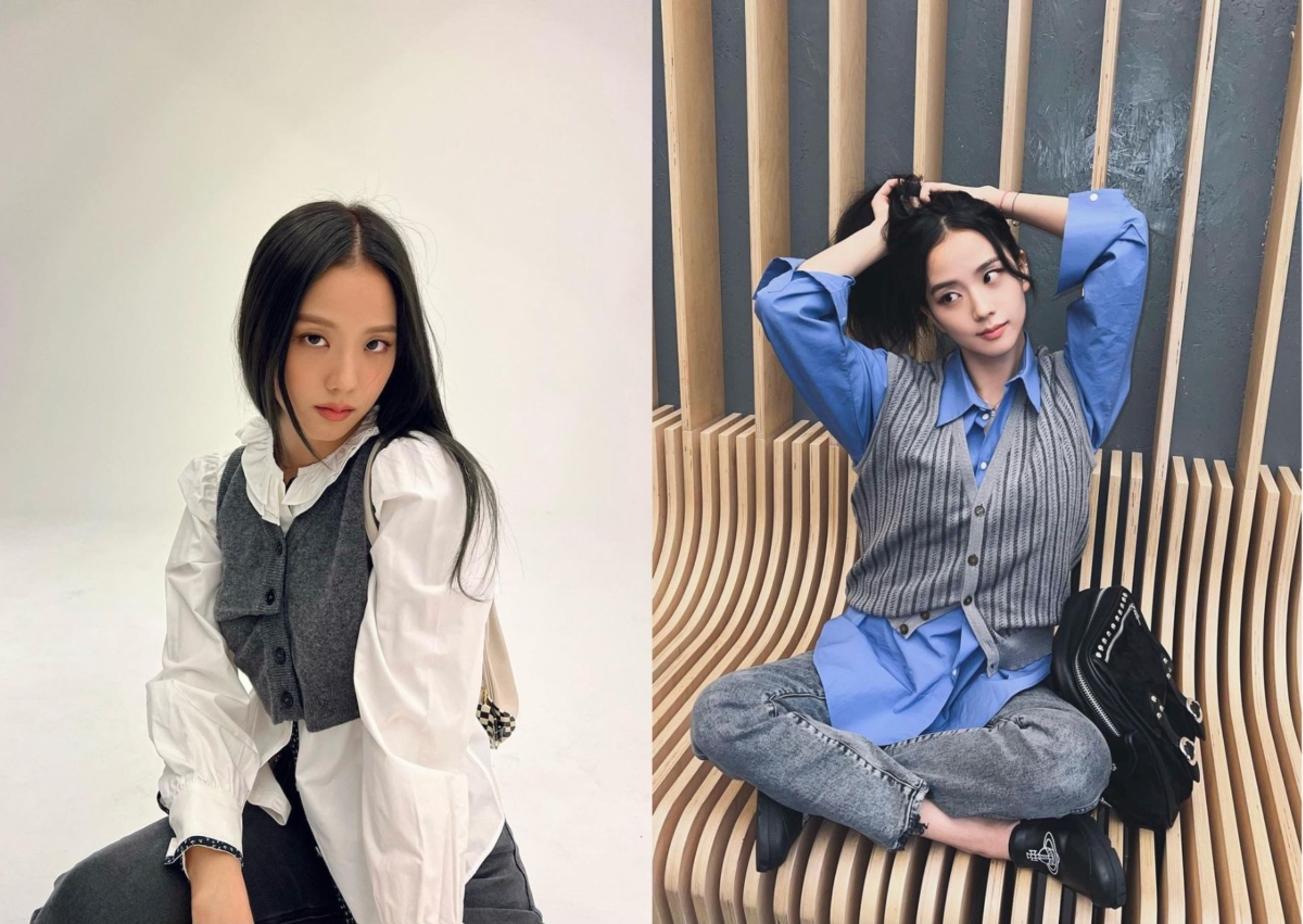 我們的小公主 Jisoo 也是清新知性女孩 Look,襯衫除了單穿、外搭之外沒想到還能當作內搭,Jisoo 穿上白色、帶有荷葉邊的襯衫,外穿灰色針織,或是以藍色襯衫搭配灰色條紋針織背心,將襯衫與背心這兩個秋季單品搭配的恰到好處。