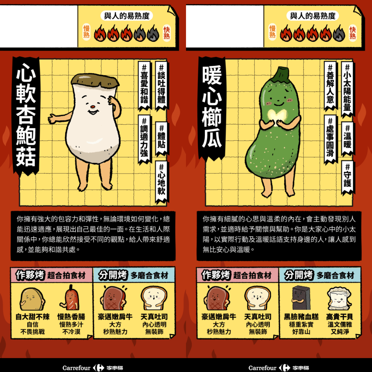 根據烤肉喜好答題完後,馬上就可以知道自己「有多容易熟」了!如果你是豪邁嫩肩牛、暖心櫛瓜、天真吐司的話,烤肉派對上大家很容易融入大家的交際王;是傲嬌蝦子、黑臉豬血糕、慢熟香腸的話,雖然與你們變熟需要時間,但相信沒過多久,大家立刻就會被你們的人格魅力所吸引!