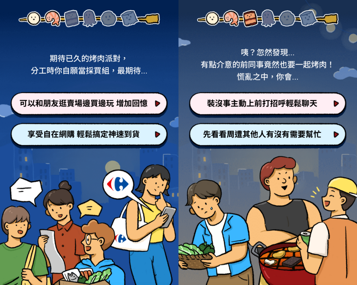「關係熟度檢定烤」心理測驗共有6題,大家可以想像自己喜歡什麼樣的烤肉聚會,比較Chill一點的聽音樂享受愜意氣氛,還是熱鬧大聊特聊的嗨場?在烤肉開始前,編輯比較喜歡和朋友一起採買逛街的感覺~有人喜歡快速網購打開就烤的方式嗎?