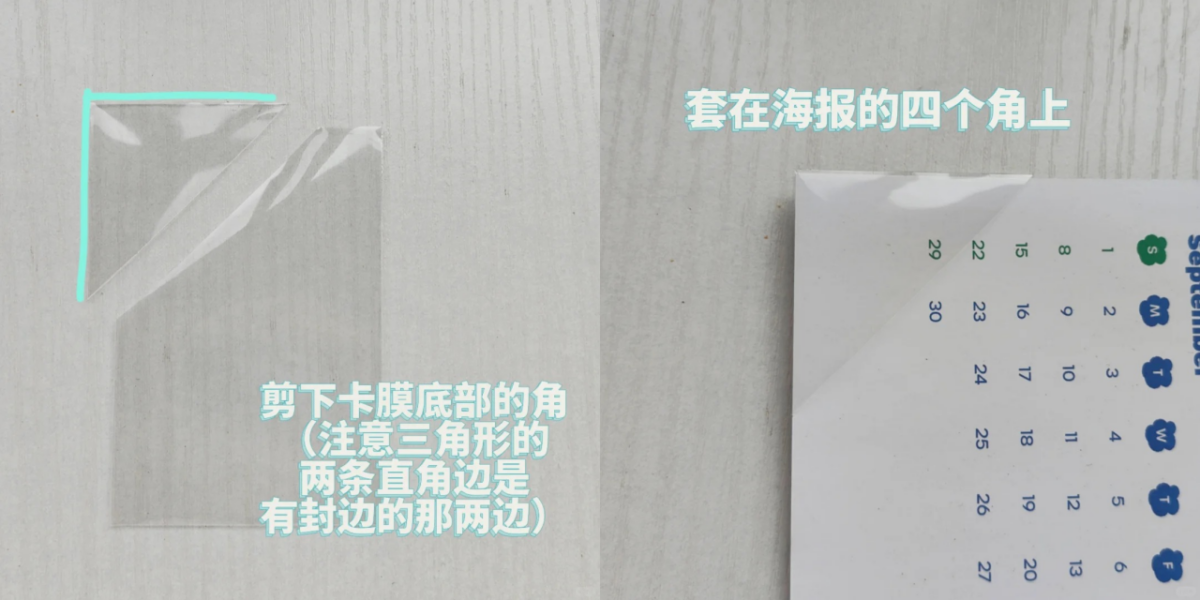 各位追星的粉絲們如果有在收集小卡的話,應該都會有幾張已經不需要的卡膜吧!先不用急著丟!大家可以將卡膜的四個角剪下來,並分別套在海報四個角上,就會立刻擁有保護海報的保護套了~