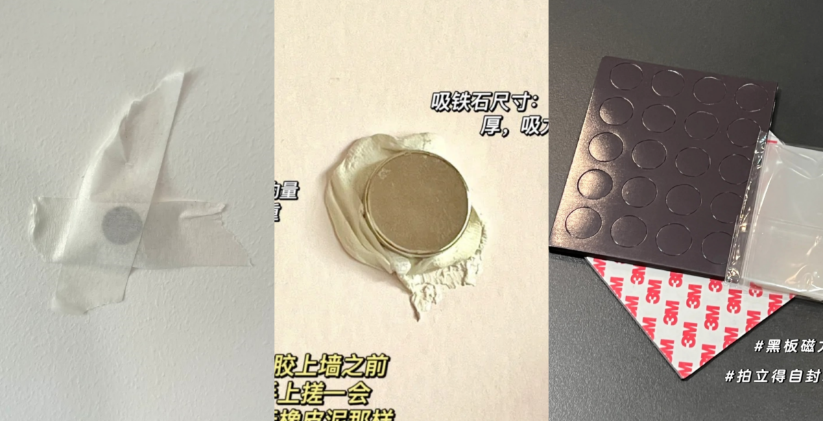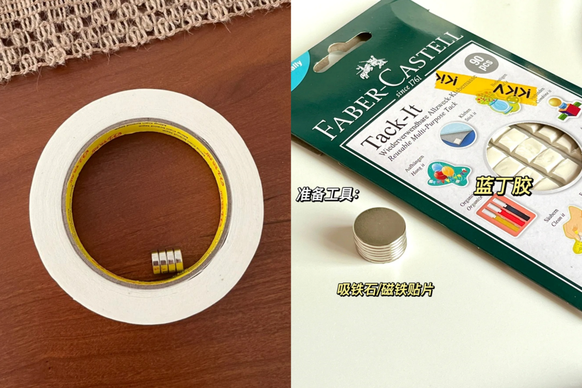 磁鐵黏貼有2種方法,首先可以準備美紋貼紙搭配2個磁鐵、無痕藍丁黏土搭配2個磁鐵,或是3M磁鐵貼紙1個磁鐵。