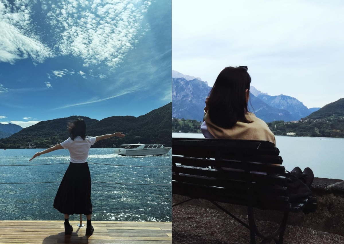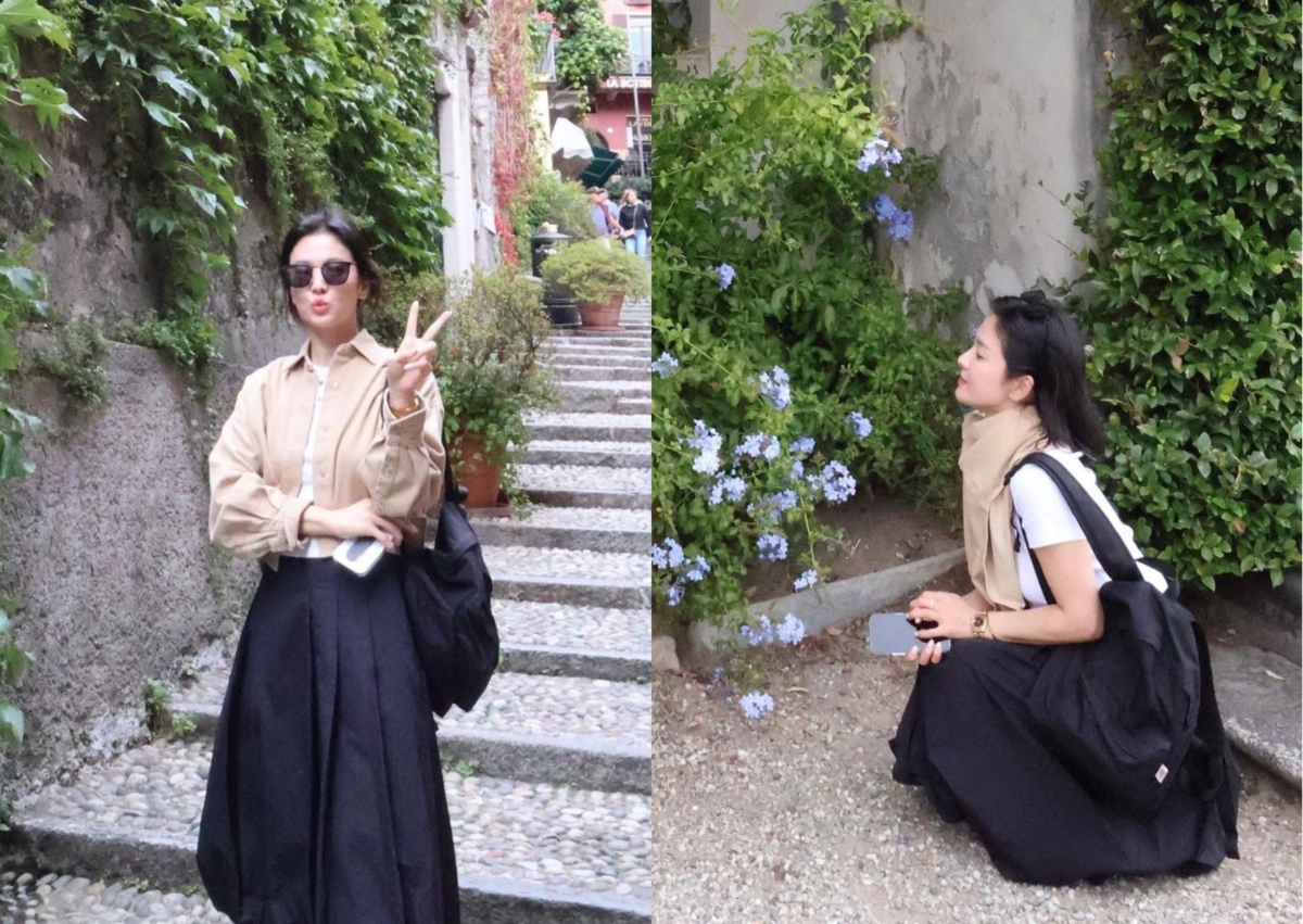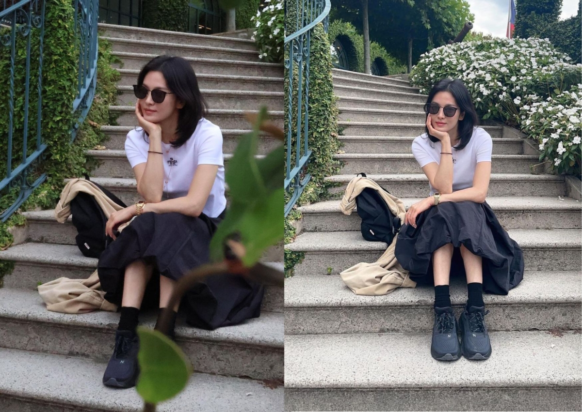 宋慧喬米蘭度假穿搭:休閒白T+黑裙、球鞋