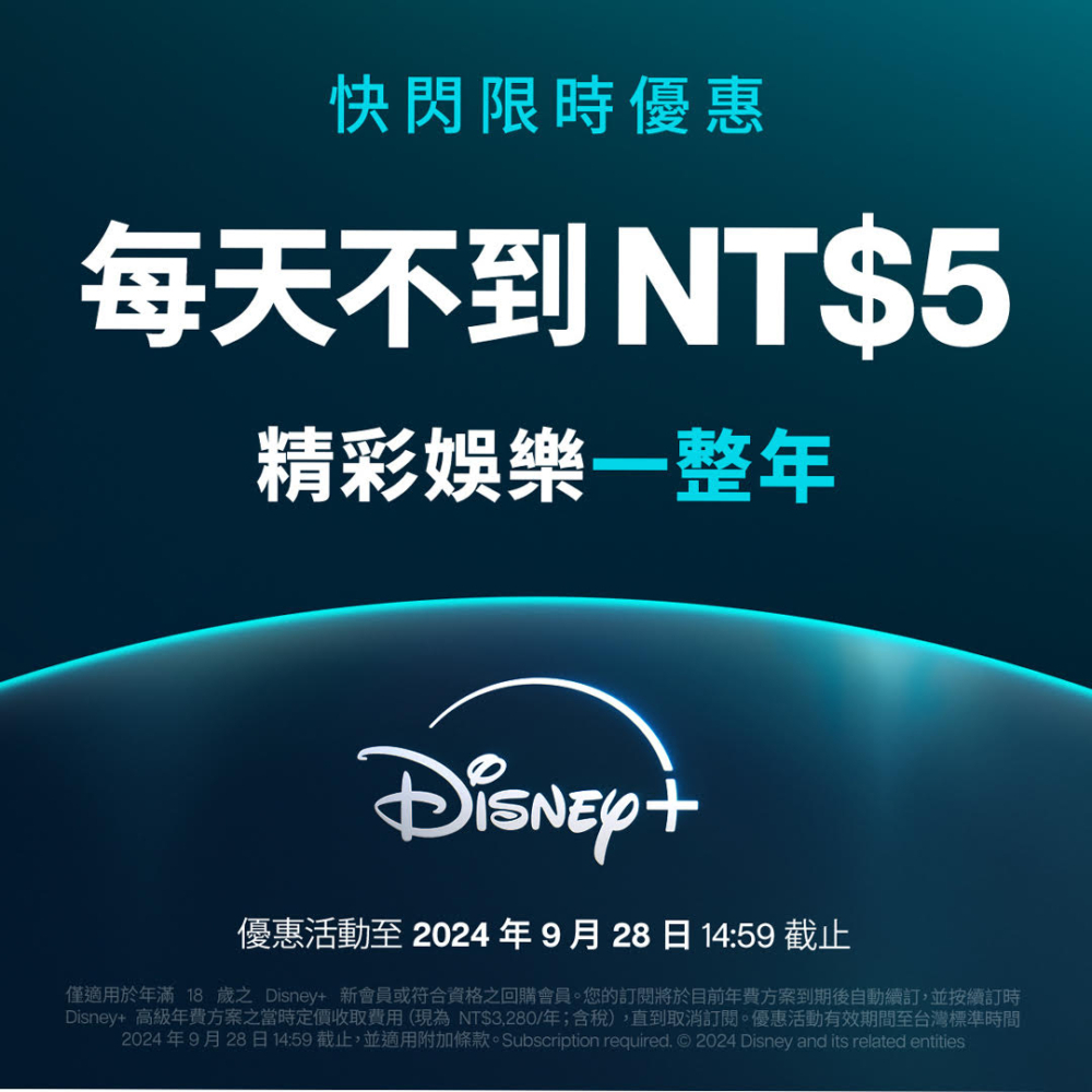 最近Disney+推出快閃限時優惠,即日起至9月28日下午2時59分,年滿18歲以上Disney+全新會員或符合資格的回購舊會員,即可以NT$1680元訂閱一年Disney+ 高級方案(原價NT$3280),每日不用NT$5就可盡覽精彩娛樂一整年!現在就趕快上disneyplus.com訂閱起來吧~