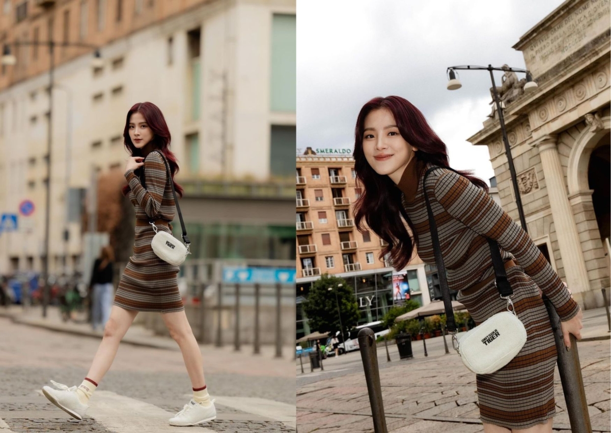 平采娜在出發大秀前先在社群釋出了多張米蘭時髦街頭照,身穿一件 Onitsuka Tiger 條紋針織連身衣,腳踩 Onitsuka Tiger 白色平底運動鞋,肩揹毛毛鞋揹包,一頭紅髮與穿搭相互呼應,既休閒又百搭。