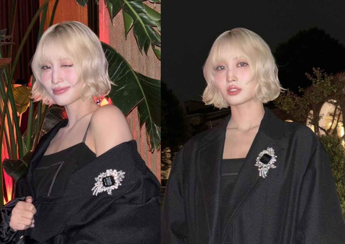 Momo 以一身 Onitsuka Tiger 黑色整件式造型現身,看似風衣、襯衫的廓形,又帶有洋裝的飄逸俐落感,落肩低胸的設計看起來性感又慵懶,而低胸、小露香肩的設計點綴上一枚品牌鑽釦胸針,別在胸前、當作固定或裝飾在一旁都好看,穿上身還有不同感覺,重點是 Momo 以一頭金色短捲髮亮相,宛如人間芭比!